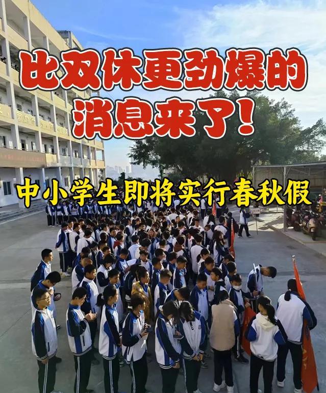 中小学生春秋假要开始了,浙江省是首个推行的省份,全省推行,春假多安排在4-5月,杭州2025年春假为4月28日至30日,衔接“五一”形成连休,;秋假集中在11月,宁波、湖州、嘉兴、金华兰溪等多地秋假始于11月12日,衢州暂定为11月19日,金华(除兰溪)为11月21日,均与周末衔接成5天假期。 广东省佛山市是试点,秋假始于11月12日,共3天,春假安排在“五一”前后,时长2天。 湖北省,利川市2025年春假始于4月7日,连休清明共5天;秋假时长不少于1周,具体时间由县市自主确定。