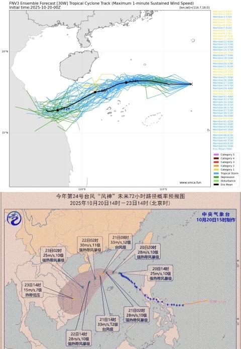 台风风神继续增强,逐步趋向海南南部近海 目前位于南海北部海面台风风神,强度达到强热带风暴,未来强度继续增强,最强可达台风级。路径方面变化不大,逐步趋向海南南部近海。继续朝西北偏西方向移动,明天与南下冷空气相遇影响,路径往西南偏西方向移动,22日紧擦海南岛南部近海。之后趋向登陆越南东南部。天气 台风