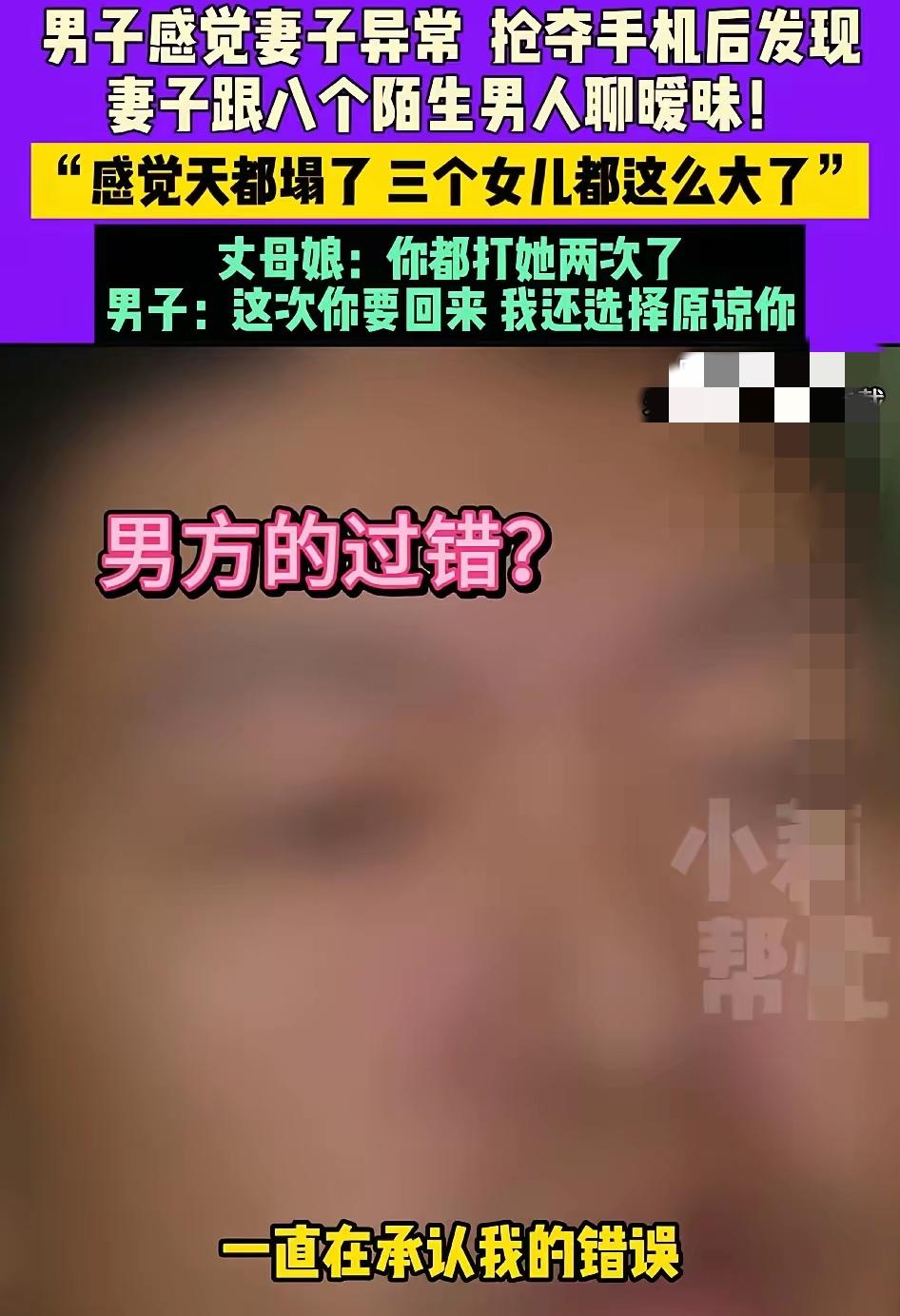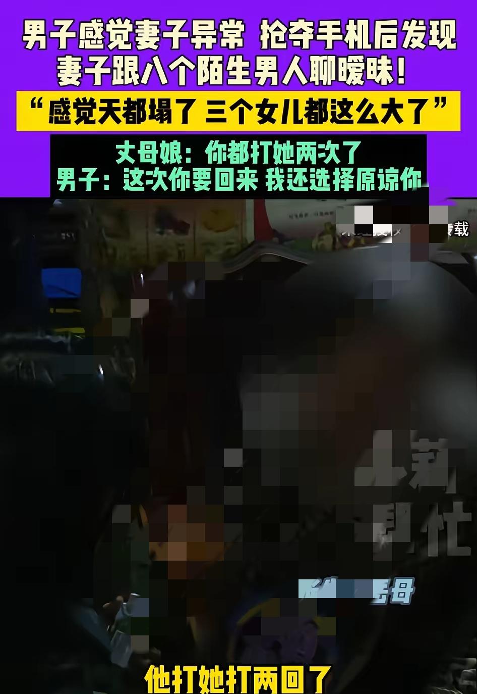 男子感觉妻子异常,抢夺手机后发现妻子跟八个陌生男人聊暧昧!这大哥的遭遇,看了真让人又气又心疼——家都快散了,他还在琢磨“孩子不能没有妈”。 大哥在外打工养家,还是他爸先发现儿媳跟人开房,他气到动手打了两次,结果丈母娘一句“你都打她两次了”,直接把锅甩到他身上。更揪心的是,他对着记者还反思“不该抢手机”,甚至说只要妻子回来就原谅。 有人骂他窝囊,可我懂他怕的是三个女儿没妈疼。但婚姻不是单方面忍出来的,她能同时跟八个人暧昧,根本没把这个家放在心上。大哥的原谅,与其说是爱,不如说是怕孩子受委屈。 要是你遇到这种事,会为了孩子忍下去,还是果断分开?
