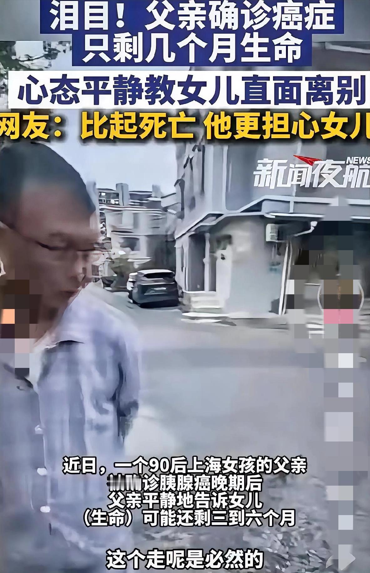 泪目了!刷到上海这位爸爸的视频,我鼻子一酸——哪有什么“洒脱面对死亡”,不过是把最痛的怕,都藏在安慰女儿的话里了。 五六十岁,本是该含饴弄孙的年纪,他却拿到了胰腺癌晚期的诊断书。刚开始他也难受,可看见家人红着眼圈,反而先稳住了心神。那天他拉着女儿的手,语气平得像在说天气:“爸没多少时间了,提前跟你说,是怕到时候你没准备。”还笑着补了句“谁都得走这条路,就是早晚的事儿”。 女儿掉眼泪的时候,他肯定也在心里掐着劲儿忍吧?自己扛着病痛,却先给女儿做心理建设,这哪是“无能为力”,明明是父亲最笨拙也最沉的爱——到最后一刻,想的还是别让孩子太难过。 要是你家里遇到这样的事,你觉得最难开口的,会是哪句话呢?