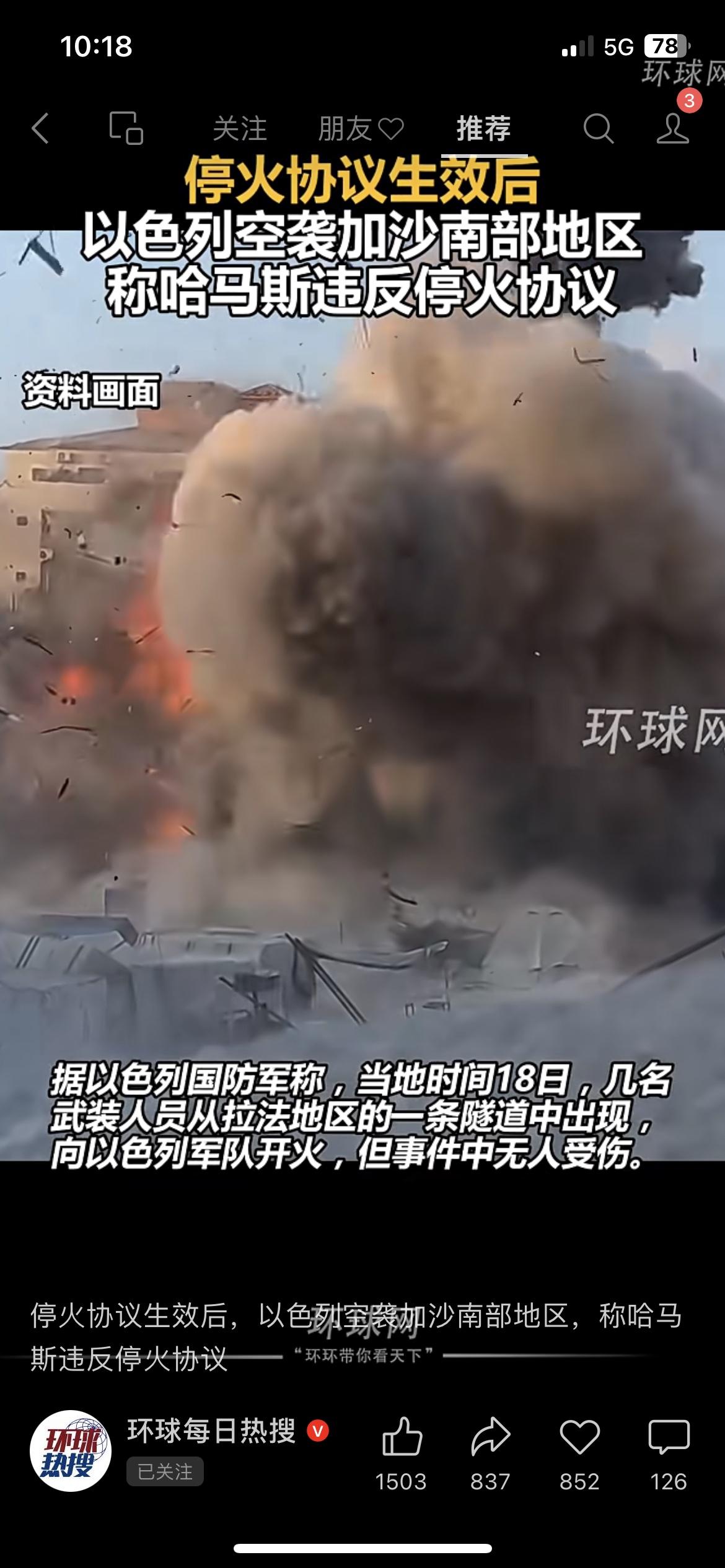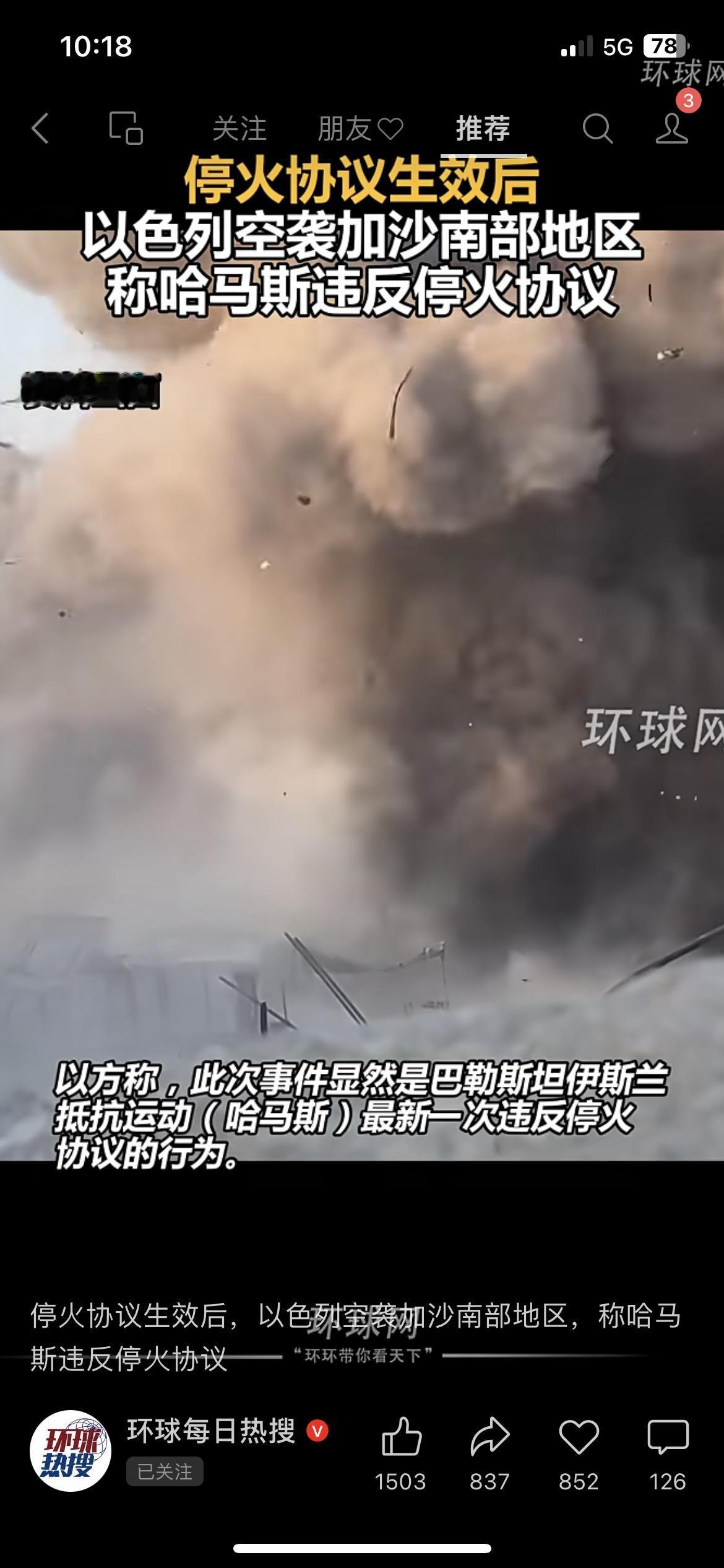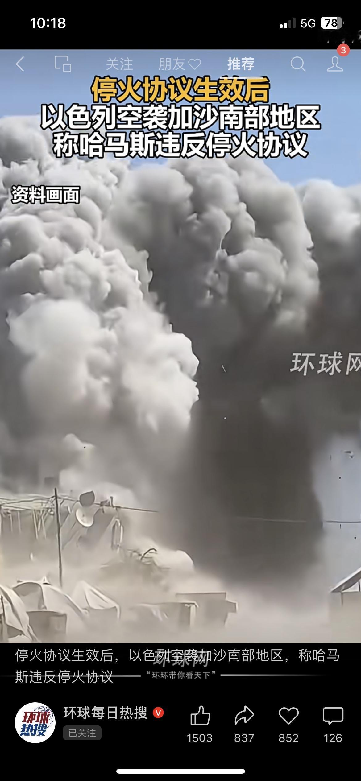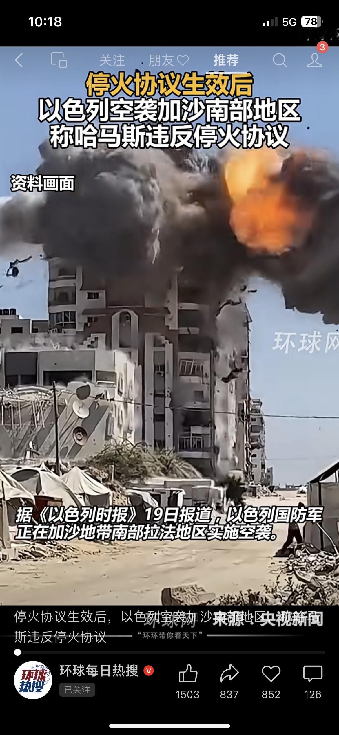 【突发!停火协议刚生效,以色列空袭加沙南部!局势再陷紧张】 当地时间10月19日,停火协议生效后不久,以色列国防军突然对加沙南部拉法地区实施空袭,称哈马斯违反停火协议。 据以方消息,18日几名武装人员从拉法隧道向以军开火(无人员受伤),这成为其空袭的“理由”。画面中加沙建筑在爆炸中浓烟滚滚,断壁残垣间硝烟弥漫,停火的希望再次被炮火撕裂。 当前巴以局势波谲云诡,每一次冲突升级都牵动着全球目光。和平曙光刚现又被遮蔽,无辜平民的安危谁来守护?巴以冲突