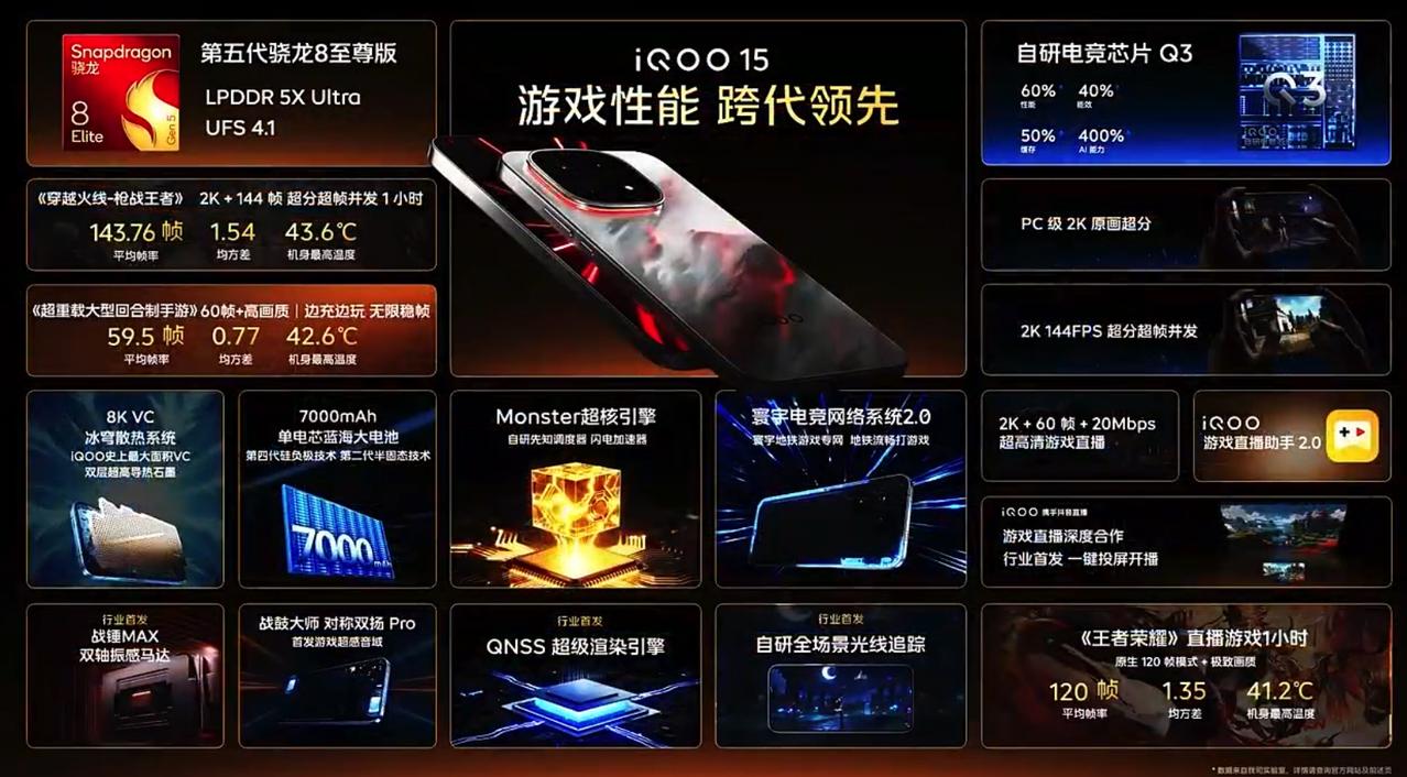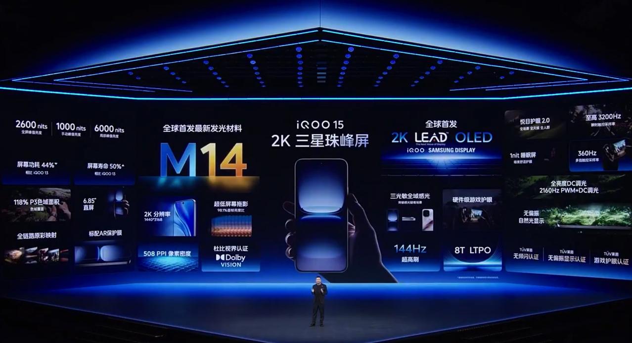 iQOO 15发布 6.85英寸三星2K分辨率,144hz刷新率,M14发光材料 2K LEAD OLED技术全球首发 局部峰值亮度6000尼特 全亮度DC调光 2160Hz PWM+DC调光 标配AR超清增透保护膜 自研电竞芯片Q3 2K+144Hz超频超分并发 游戏全场景追光 QNSS超级渲染引擎 高通第五代骁龙8至尊版处理器 9600Mbps的LPDDR 5X Ultra+最新UFS 4.1 安兔兔跑分438万 24根天线,新增Wi-Fi芯片 1511大师扬声器 7000毫安时蓝海电池,第二代半固态 8K VC散热面积