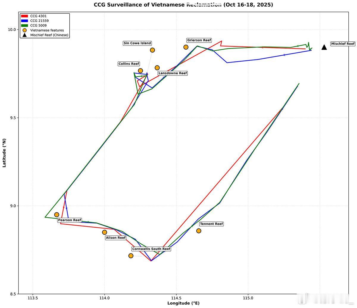 外媒报道称中国海警4301舰、5009艇和21559艇于10月16日至18日对7