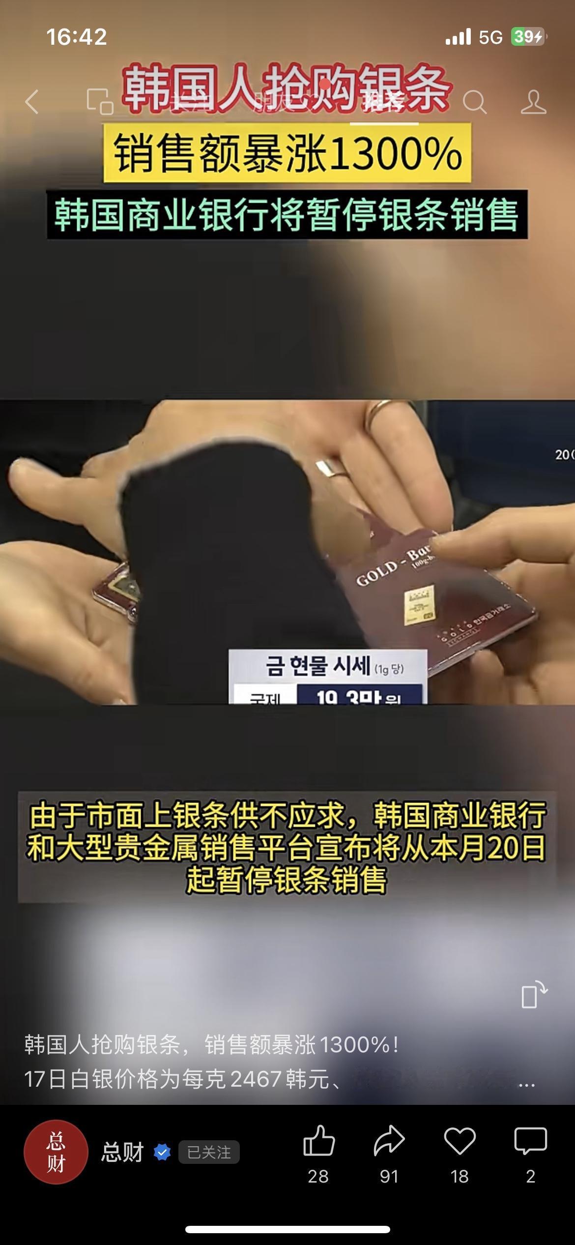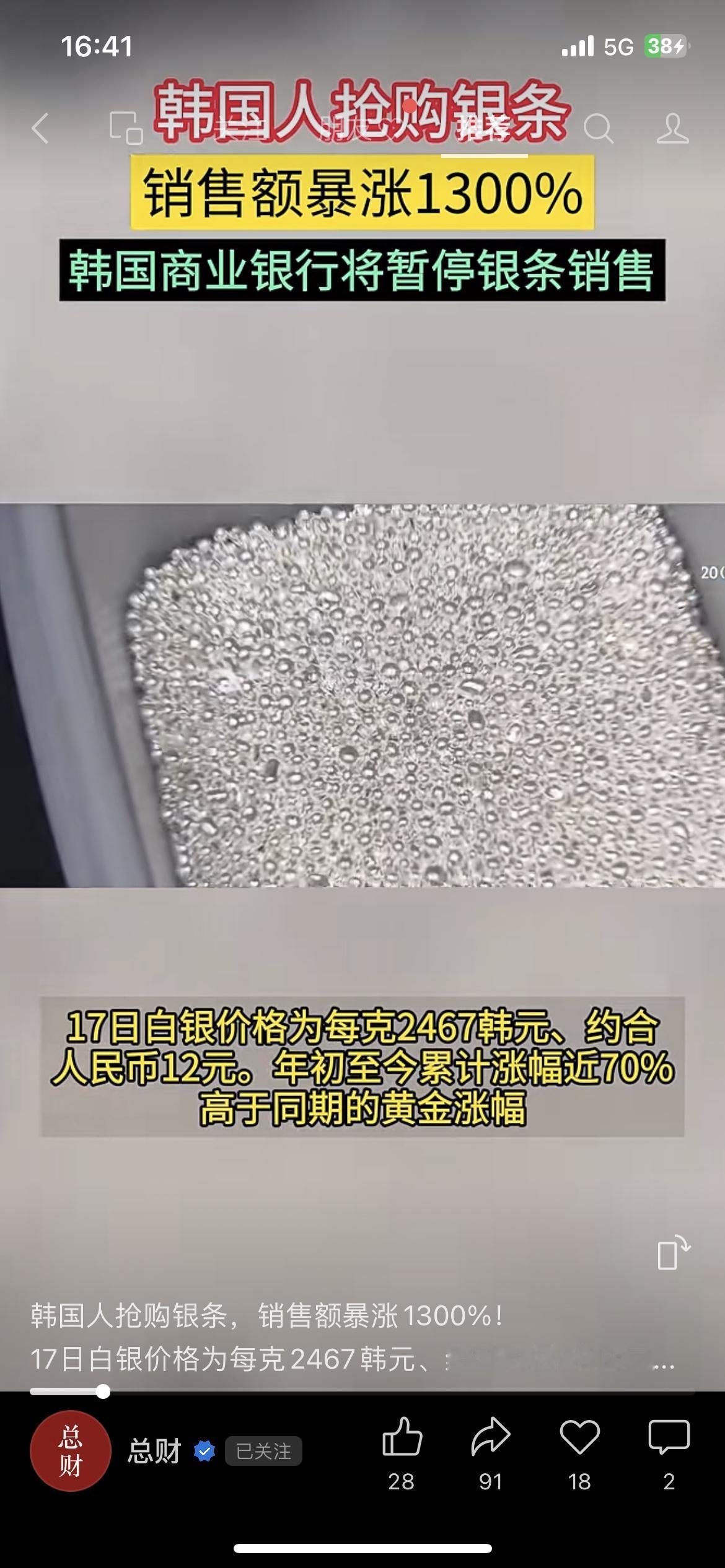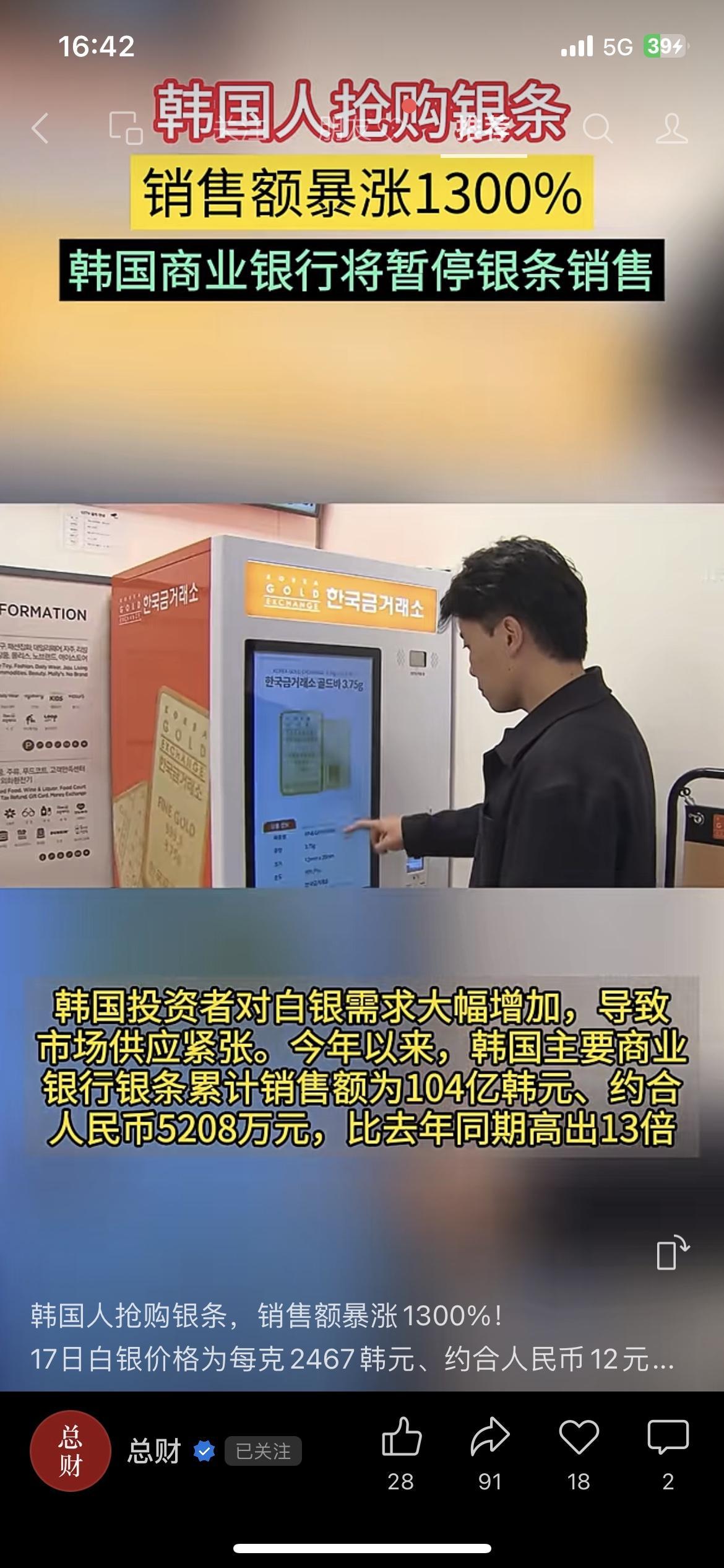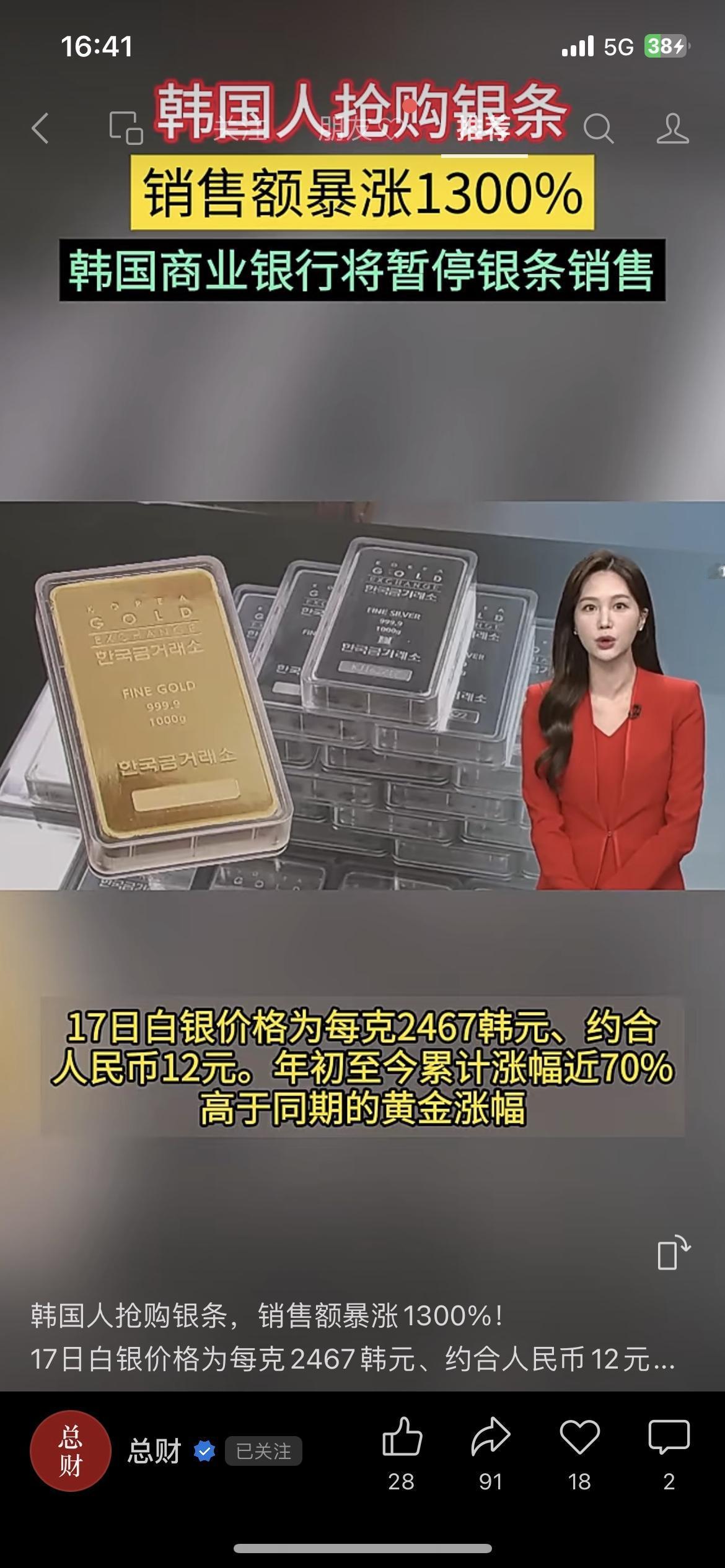 韩国人抢银条抢疯了!销售额直接暴涨1300%,银行都被迫停售了! 最近韩国银条市场彻底杀疯了!今年以来,韩国主要商业银行银条销售额狂揽104亿韩元(约合人民币5208万元),比去年同期直接涨了13倍!因为市面上银条抢都抢不到,韩国商业银行和大型贵金属平台官宣:从本月20日起,银条直接停售! 17日白银每克才合人民币12块,年初到现在涨幅近70%,比黄金涨得还猛!这波疯抢潮把贵金属市场都炸开了锅,韩国投资者这是把白银当成“香饽饽”了啊~韩国金融市场 理财银条