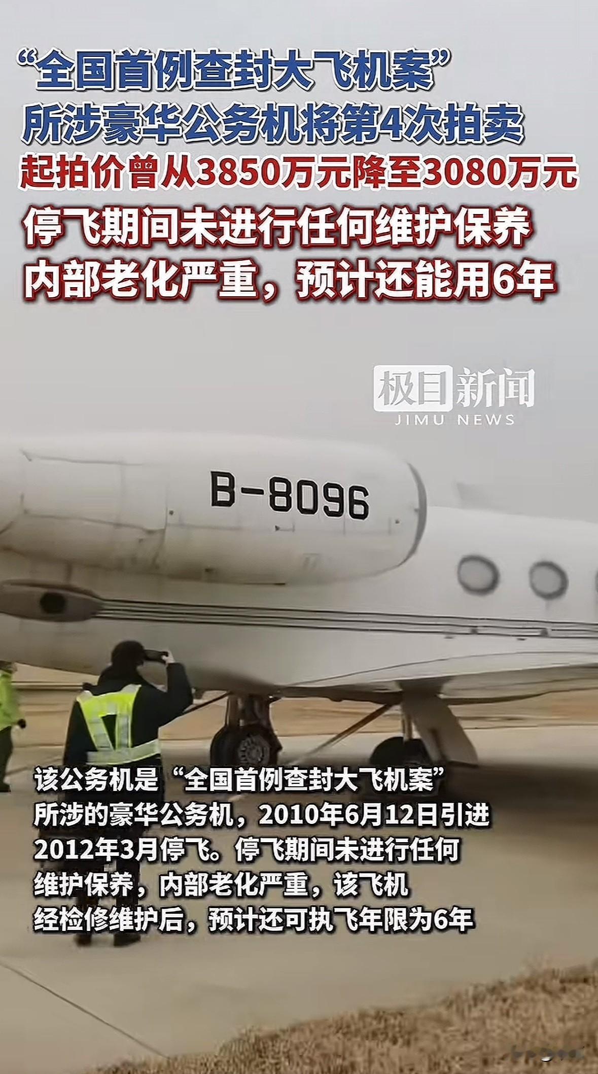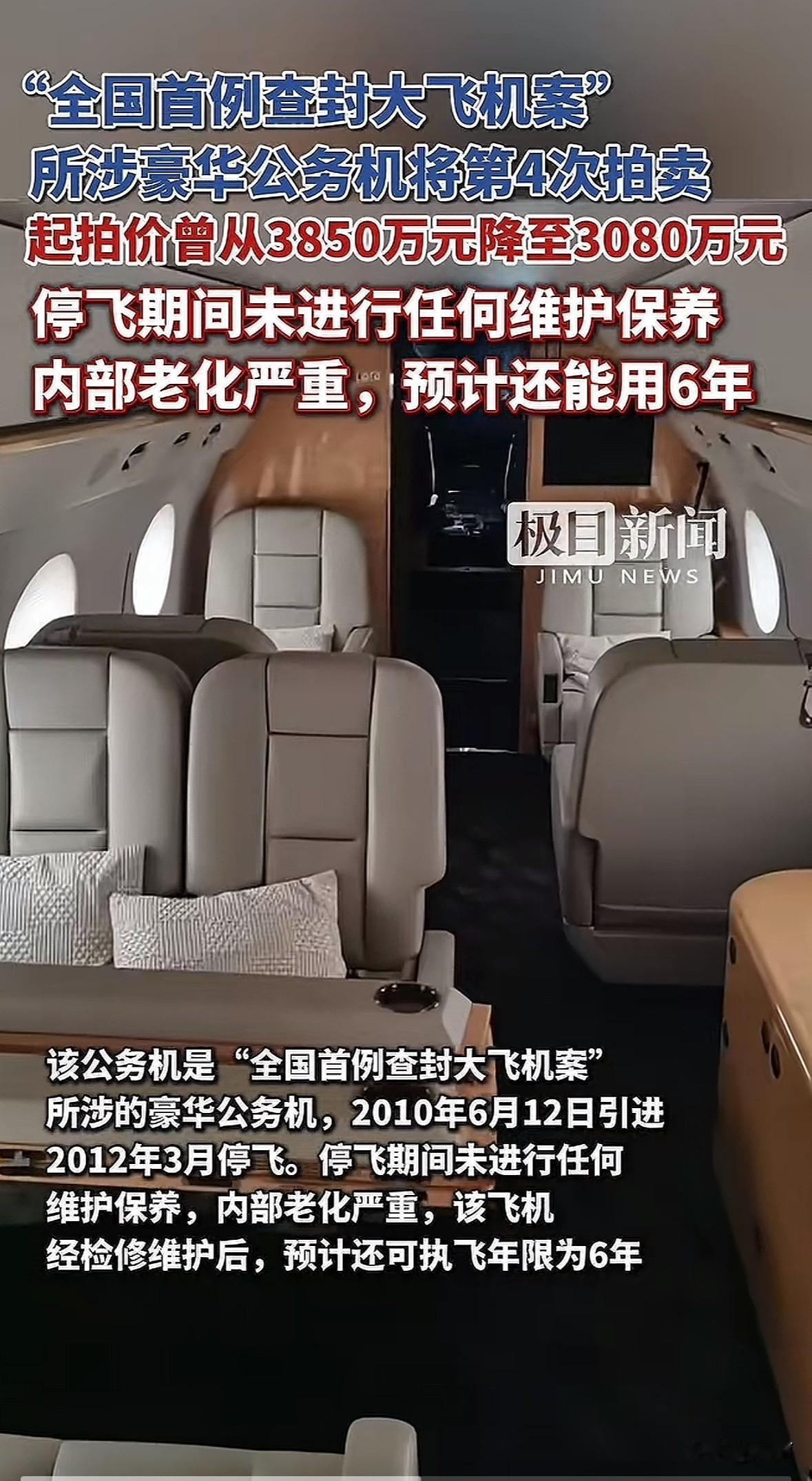 全国首例查封大飞机案有了新动静,涉事的湾流G450公务机要第四次拍卖了。 这架飞机2010年引进,原属Zola公司,当年委托北京航空管理,却拖欠数千万元服务费。2012年就停飞封存,适航证早过期,内部老化严重,检修后预计还能飞6年。 之前三次拍卖从3850万降到3080万都没人要。评估价5500万,现在起拍价打了六折仍遇冷。 这事看着唏嘘,再贵的飞机停久了也成“烫手山芋”,后续维护要花钱,普通买家接不住。但这案子也说明,不管资产多特殊,欠债还钱的规矩不会变,司法执行照样能落地。
