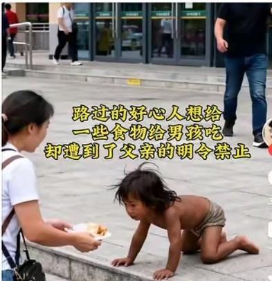 路过的好心人想给 一些食物给男孩吃 却遭到了父亲的明令禁止 路边小孩饿得看着别人