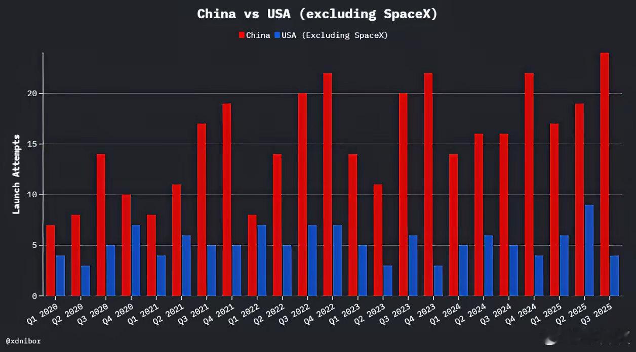 马斯克转发了一张图,画面上显示了从2020年到2025年中国和美国航天发射数量的对比,其中美国是排除了SpaceX航天发射的数量,可以清晰的看出在这种情况下,中国的航天发射次数远远超过美国,数量是后者的3-5倍,然而正是有了SpaceX的可重复发射火箭,美国总体数量才能大规模反超中国。