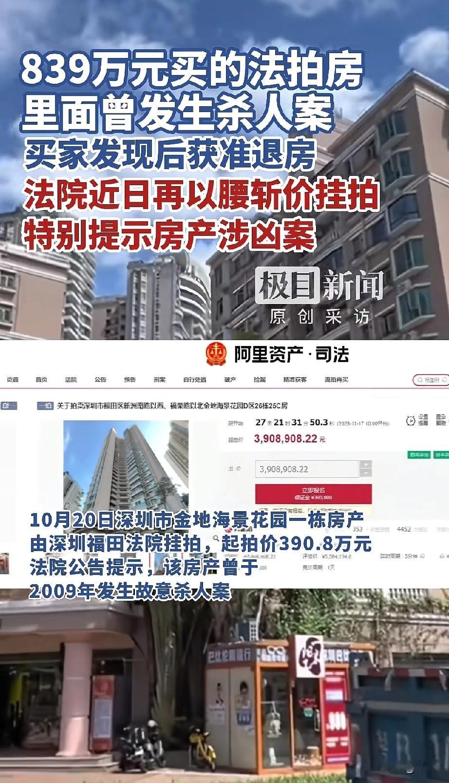 深圳福田金地海景花园一套130.85平米的法拍房,今年6月以839.76万元成交。买家后来发现这房子2009年发生过故意杀人案,法院首次拍卖没提这事儿。 法院最终撤销交易,认定未披露信息导致买家重大误解,符合法律规定。现在房子重新挂牌,起拍价390.8万,单价不到3万,比市场价低不少。 目前有近4800次围观,没人报名。法院说房子现在有人住,成交后15天内会搬离,会协助交房。 这事儿很清楚,“凶宅”是重大瑕疵,法院必须披露。就算价格打骨折,大家心里还是犯怵,自住要图踏实,投资也怕砸手里。法拍房的信息透明太重要了。