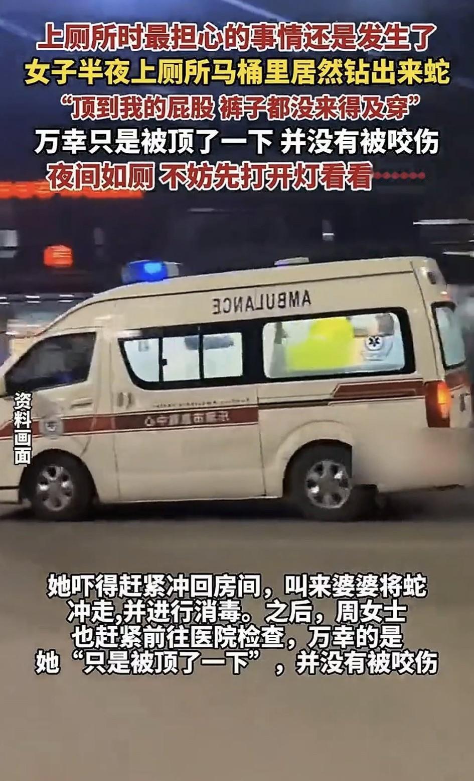 最担心的事还是发生了!江苏,一女子晚上十一点多去上厕所,结果刚坐马桶没一会,她突然感觉到马桶里有东西伸了出来,还顶了一下她的屁股。起初她也不知道是什么东西,但当其回头一看时,直接吓得她惊叫连连,原来是马桶下水道里,钻出来一条黄绿色的蛇! 随即,女子被吓得赶紧跑回房间,后还是胆大的婆婆将蛇冲走,并对厕所和马桶进行了消毒。之后,女子也赶紧前往医院检查,万幸她只是被顶了一下,并没有被蛇咬伤。 而此事被女子发到网上后,也只引起了网友们的一片热议。有网友就表示:以前刷视频的时候刷到过,没想到,最担心的是真的就发生了,下次上厕所先按一下冲水保险一点。 还有网友表示:我坐在马桶上刷到这事的时候还在笑,但反应过来是厕所和马桶后,我笑不出来了,也不敢继续上厕所了… 更有网友表示:我觉得还是应该报警,这要是楼上楼下的,万一被冲到下一家咋办,还是直接清除为妙。 不得不说,幸好有惊无险,只是被吓到了人没事,这要是真被咬一口,那事情就麻烦了。看来,不管是夜间还是白天如厕时,都不妨先打开灯检查一下,确定没问题后在使用吧,不然真的好吓人! 对此大家怎么看?