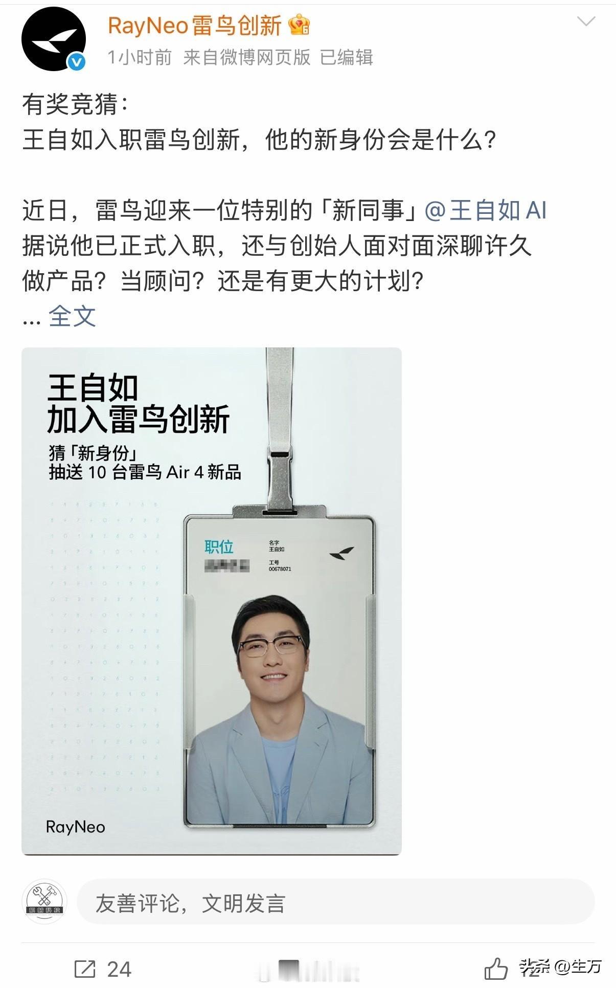 王自如还是去上班了! 从格力出来之后,王自如搞了一段时间自媒体,就在大家以为他会从事自己的老本行的时候,今天已经有公司宣布他加入了! 这个公司很多人没有听说过,叫做雷鸟创新,因为它是一家AI公司,所以他的产品大家能够看到的都是一些穿戴设备,比如眼镜之类的。 不知道他们让王自如来公司负责哪一块儿,因为王自如曾经从格力出来的时候也说过,他会从事AI行业,大家都以为他会自己搞一个AI公司,没想到现在还是去上班了! 可能对现在的他来说,单打独斗还不如加入比较有实力的公司,慢慢地继续学习这个行业,说不定还能够干出一番事业来,而且现在这个AI行业确实是一个比较新型的行业。 只是他在里面估计也不能够做任何技术类型的工作,最多就是卖卖产品做做销售之类的,毕竟这个行业也能够划分到他曾经熟悉的大的数码领域里面去,算是从事自己的老本行吧。 但愿他能够在这个行业里面,踏踏实实地好好干下去,能够和新的老板和同事相处的融洽,找到适合自己的位置,这个行业与以前的格力那种传统制造业还是不一样的,属于创新型的公司,所以他现在上班就应该要看工资条了,毕竟他以前该学的在格力也学得差不多了。