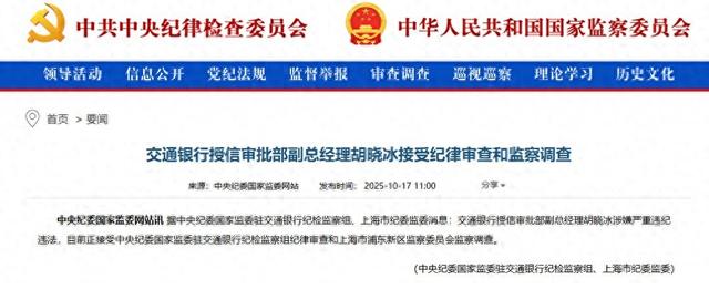 10月17日,据中央纪委国家监委驻交通银行纪检监察组、上海市纪委监委消息:交通银行授信审批部副总经理胡晓冰涉嫌严重违纪违法,目前正接受中央纪委国家监委驻交通银行纪检监察组纪律审查和上海市浦东新区监察委员会监察调查。