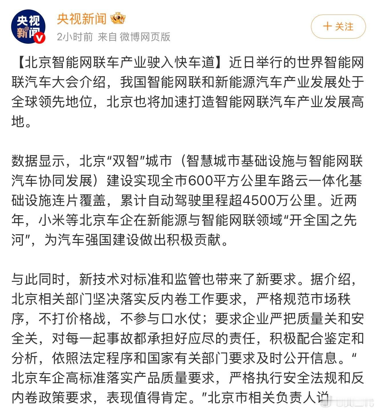 刚看到媒体报道,要求车企别搞价格战,得把质量和安全放在第一位,相关负责人也肯定了小米汽车的做法。现在智驾发展的很快,目前为止累计测试4500万公里的里程已经非常可观。小米等企业在核心技术、国际交流、安全驾驶培训上都有实际付出,相信大家也有目共睹;我自己也参加过一次小米安全驾驶培训,整个活动可以说非常用心了,毕竟作为车主还是要更深入了解自己车辆的极限,以免不时之需。现在咱们买车,图的就是个放心和靠谱,你说对吧[笑而不语]