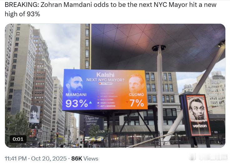 佐兰·曼达尼成为下一任纽约市市长的几率创下新高,达到 93%。