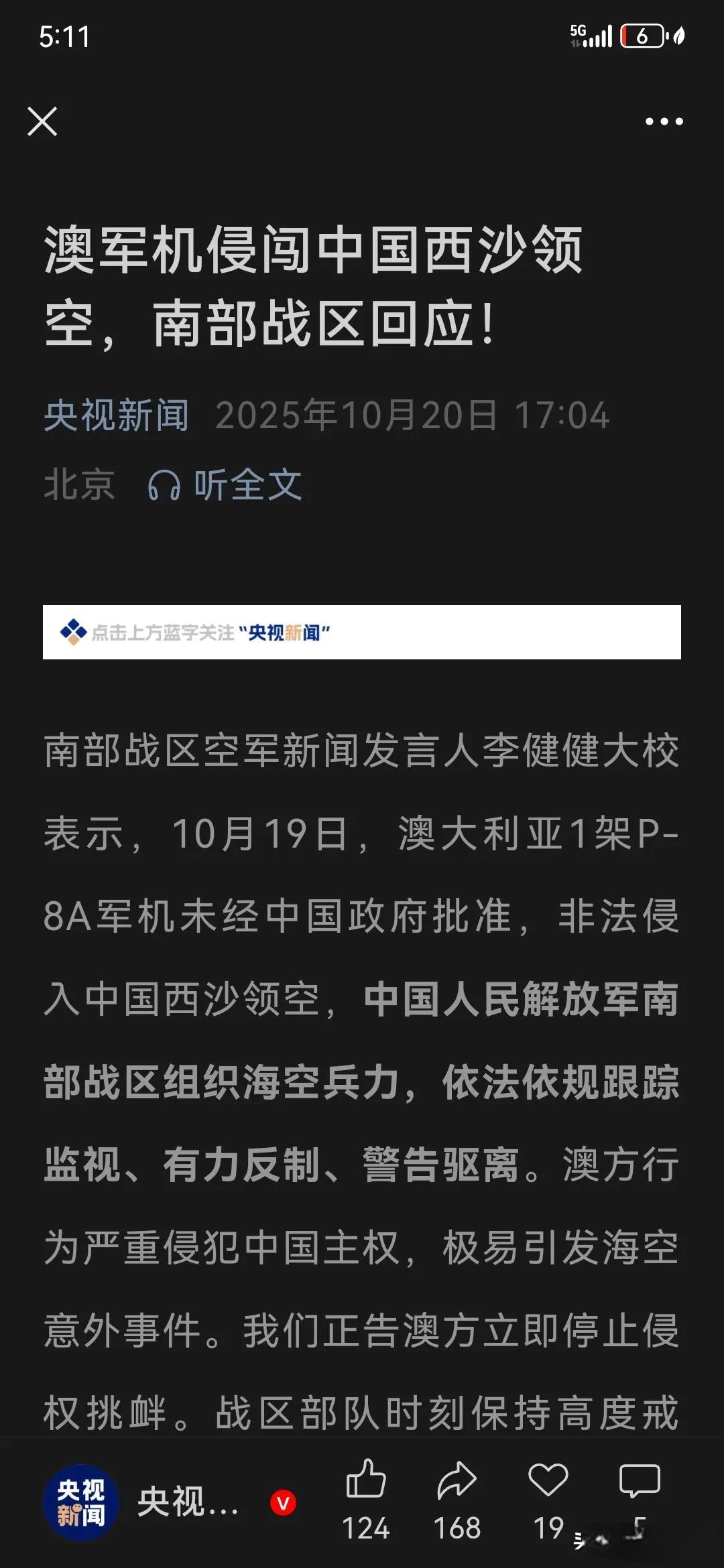 去年2月,一架澳军P-8A在西沙偷偷贴海侦察,我军歼-16直接斜切机头,30米外甩出一串红外弹,舷窗瞬间被照成白天,澳机组当场呼叫“unsafe!” 才隔20个月,同一型号、同一空域,10月19日又冒头。南部战区深夜通报只有一句——“有力反制”。没细节,但越短越带劲:上次是弹雨,这次留悬念。 澳媒先跳脚:中国“危险拦截”! 网友回怼:闯院子还不许开灯? 期待公布细节