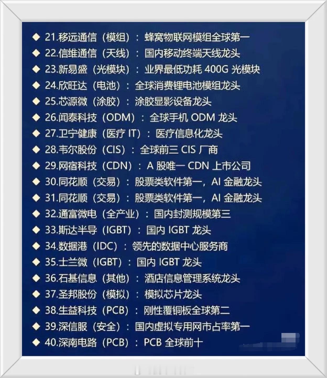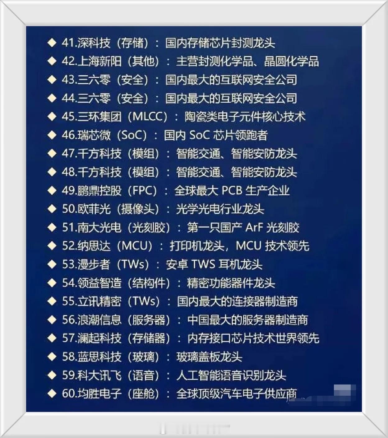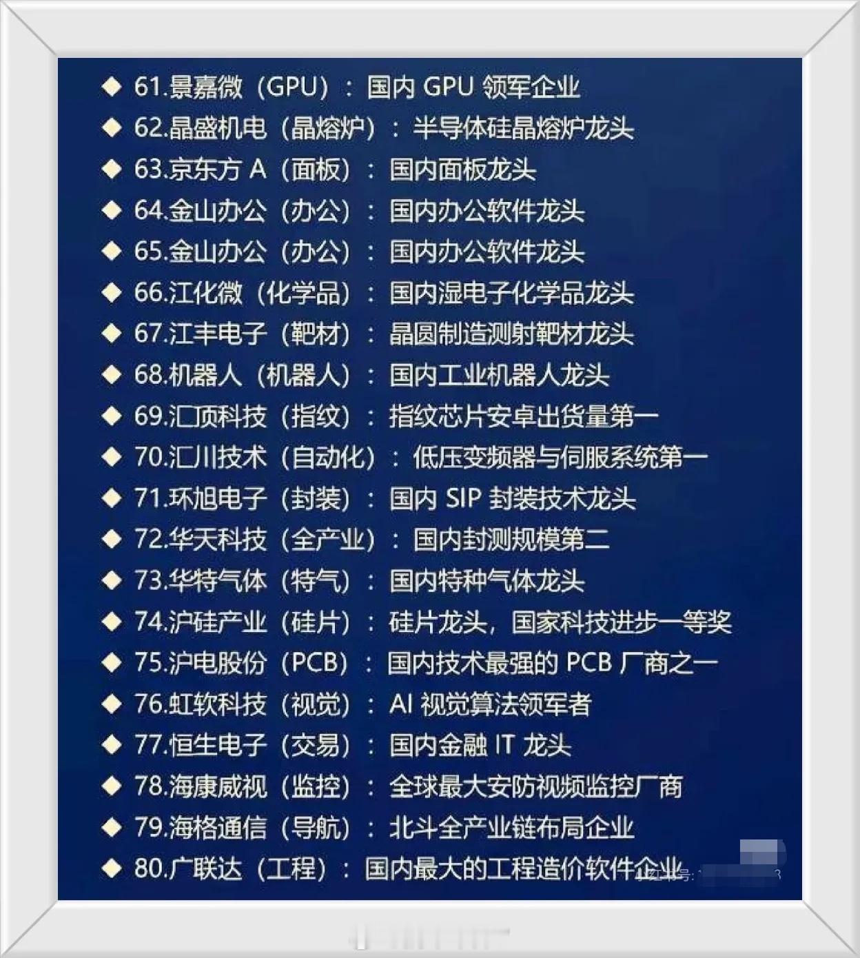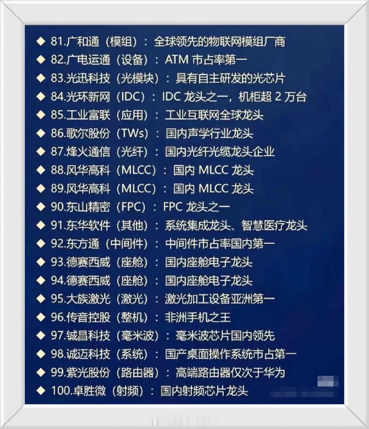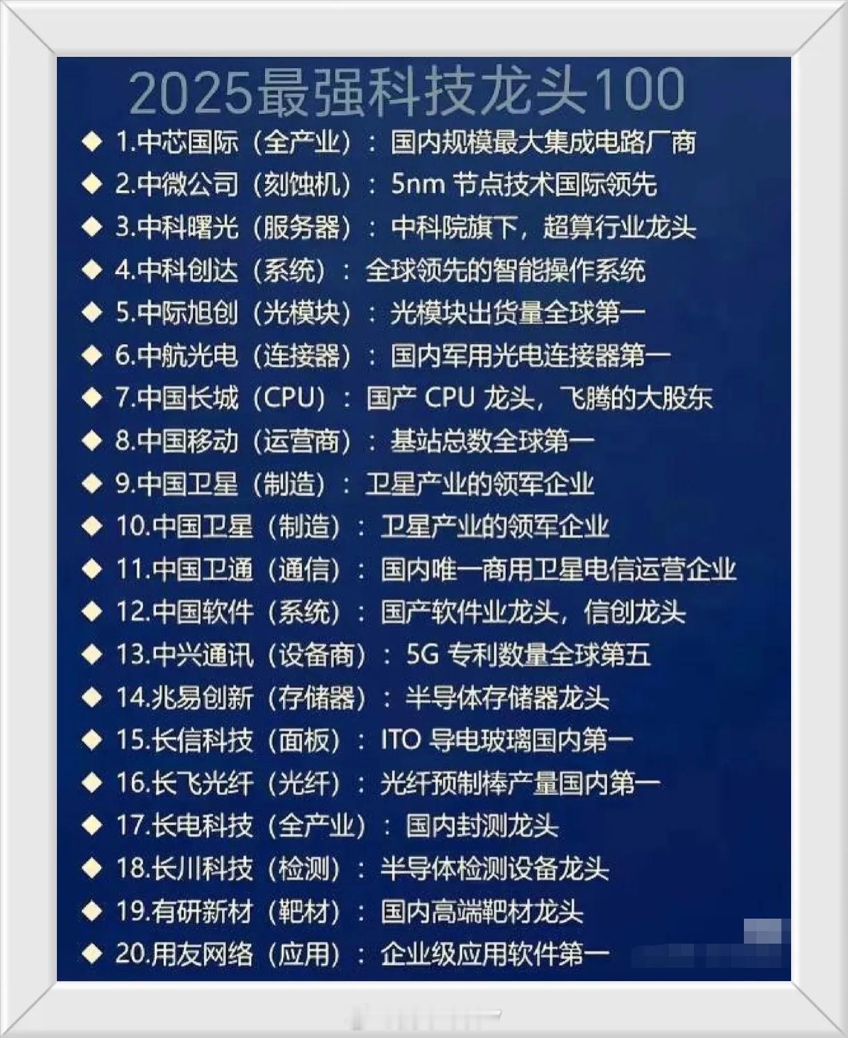 “2025最强科技龙头100”的榜单,详细列出了中国100家在不同科技细分领域处于领先地位的企业及其核心业务和成就。这些企业覆盖了从集成电路、半导体制造、通信设备、人工智能、软件服务、消费电子、物联网、云计算、网络安全、光电显示、工业自动化、精密制造、服务器、光模块、数据中心、导航、金融IT、医疗信息化、安防监控、工程软件等多个前沿和高科技领域。