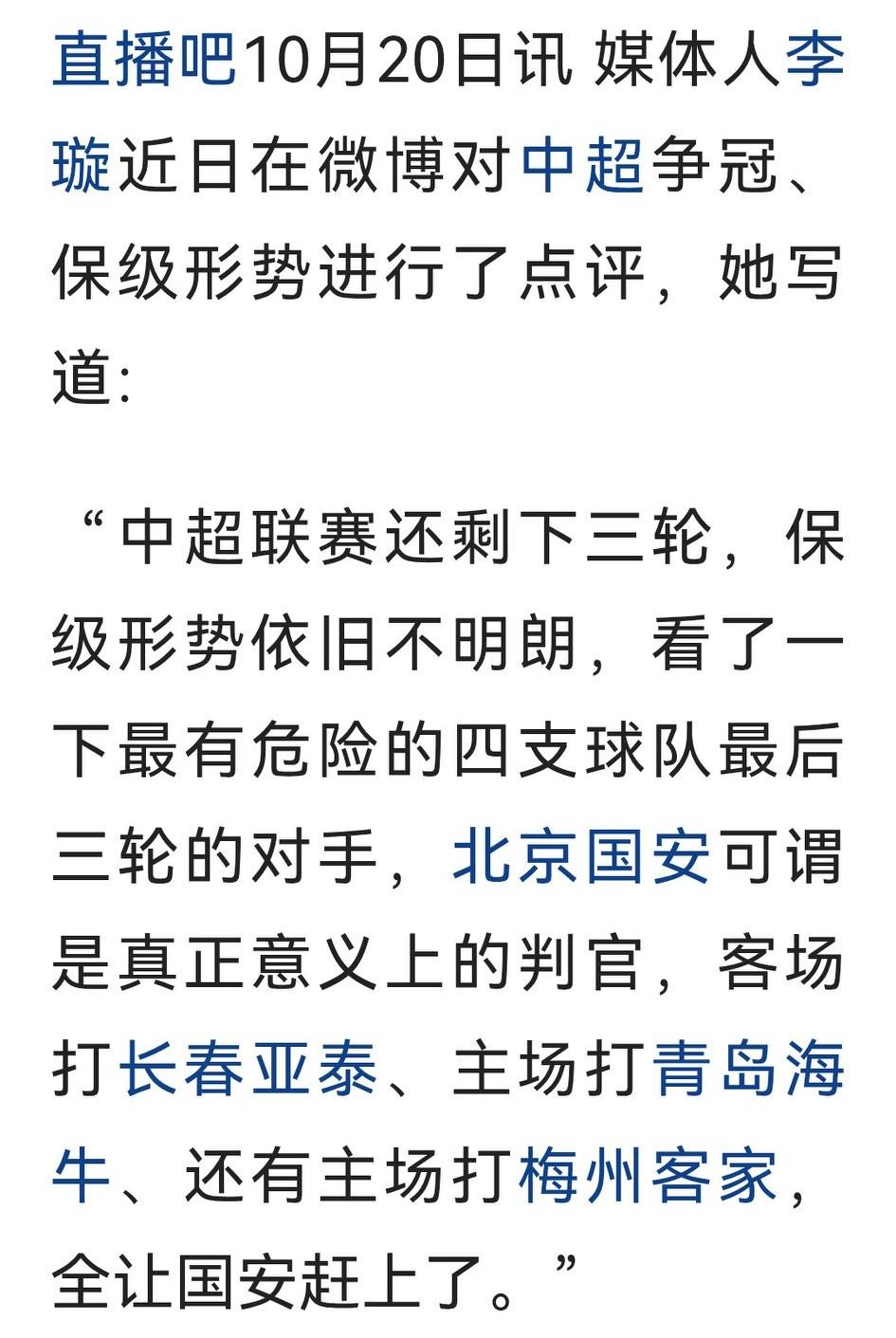 真没想到,《足球报》大编李璇也对球迷所言北京国安“保级判官”说进行附和。 中超