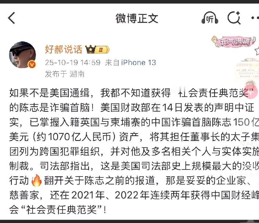 离谱!获奖“楷模”竟是诈骗首脑? 刷到条新闻直接惊掉下巴:陈志连续两年拿下中国财经峰会“社会责任典范奖”,光鲜履历背后居然是诈骗组织头目,要不是被美国通缉,这份伪装还不知道要持续多久。 这波反转太讽刺了,也给我们提了个醒:光鲜的荣誉标签未必等同于真实底色,识人辨事真得擦亮眼睛。那些看似权威的奖项背后,到底还藏着多少不为人知的真相?只能说,打破信息茧房,保持理性判断,从来都不是一句空话。 有网友评论以后再看各类“典范”,先打个问号准没错,毕竟人心隔肚皮,荣誉也能掺水分。