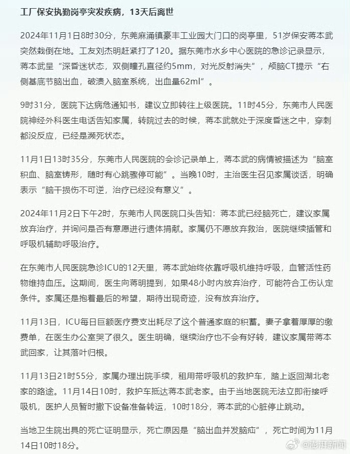 #保安上班脑出血13天后离世被拒认工伤#【保安上班时脑出血13天后离世:人社局称超48小时拒认工伤,家属已起诉】#保安上班脑出血被拒认工伤家属起诉# 工厂保安蒋本武突发疾病,倒在了值班岗亭。医院诊断为“高血压脑出血”。由于家属不愿放弃治疗,蒋本武最终在发病13天后离世。但家属的坚持,却导致此后的工伤认定遭遇难题。#死亡证明超48小时人社局拒认工伤#