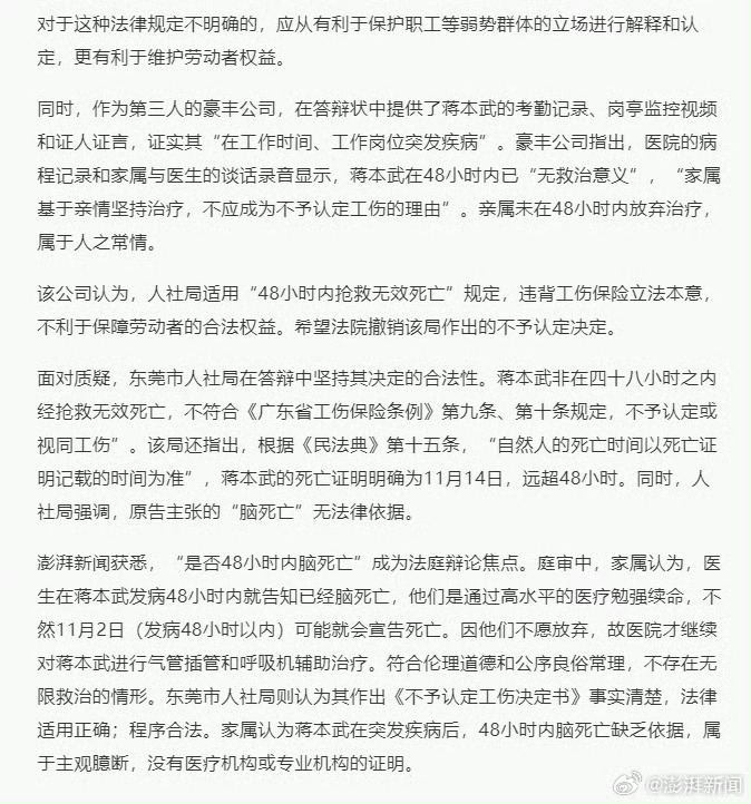 东莞市人社局在答辩中坚持,蒋本武“非在四十八小时之内经抢救无效死亡,不符合《广东省工伤保险条例》第九条、第十条规定。同时,根据民法典规定“自然人死亡时间以死亡证明记载时间为准”,而没有任何医疗机构,或专业机构证明蒋本武“48小时内死亡”。因此,不符合工伤或视同工伤的情形。
