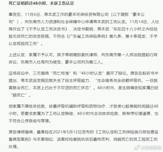 代理律师认为,蒋本武病发48小时内,医生明确告知家属已经“脑死亡”,在无存活可能的情况下,家属仍不愿放弃抢救,依靠呼吸机辅助呼吸和药物治疗才致使心脏停跳时间超过48小时。若要求家属为了工伤认定赔偿,48小时内主动放弃抢救,既有悖伦理道德,也不符合公序良俗与常理。