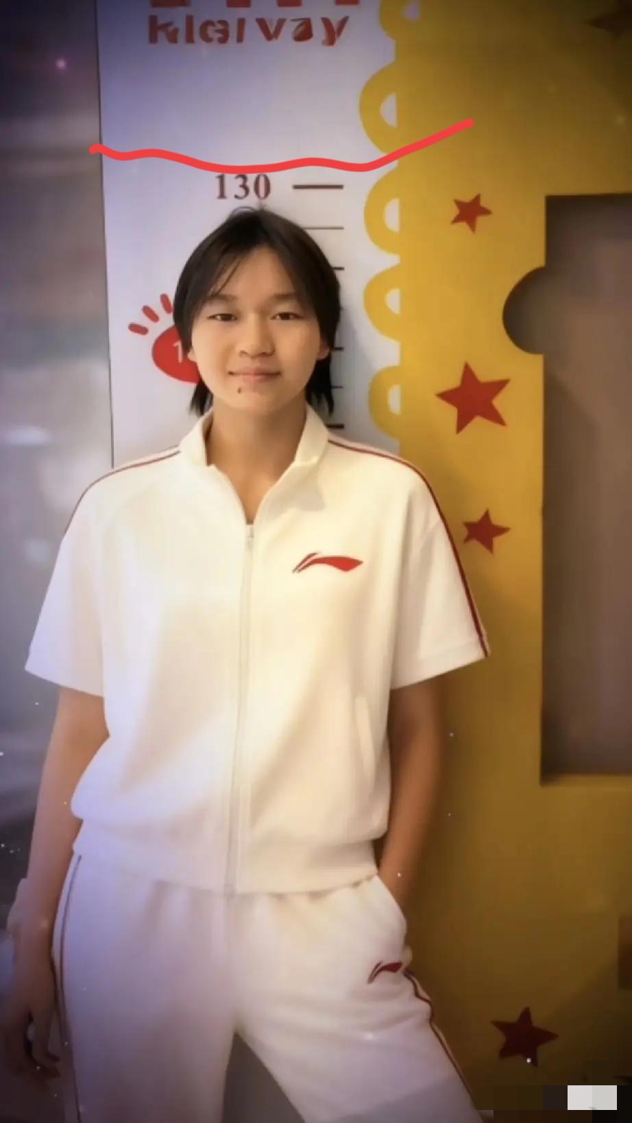 之前听全粉说,全红婵漂亮了,也长高了?身高差不多有166的样子,可是我总觉得应该没有那么高吧?直到我今天无意之中看到了这照片,她的真实身高被一览无余。 虽然她是背靠着墙有一点往下坠的感觉,但是就算她站直的话,也最多加15cm。所以她的身高其实根本就没有166吧?