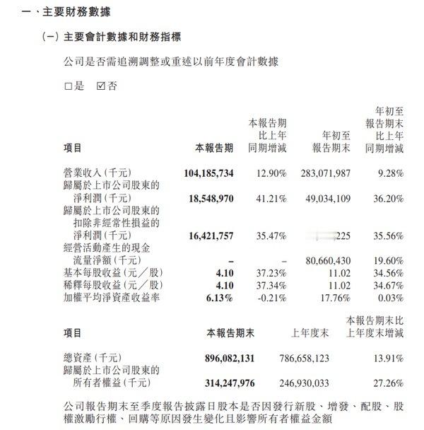宁德时代公告,第三季度营收为1041.86亿元,同比增长12.90%;净利润185亿元,同比增长41%。第三季度扣除非经常性损益的净利润164亿元,同比增长35%。前三季度营收为2830.72亿元,同比增长9.28%;净利润为490.34亿元,同比增长36.20%。