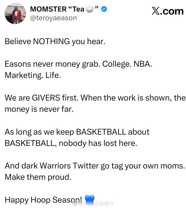 伊森从不追逐金钱。无论是大学联赛、NBA、商业推广还是人生道路亦如此。我们始终秉持“付出为先”的信念。当实力得以展现,回报自然会如期而至。