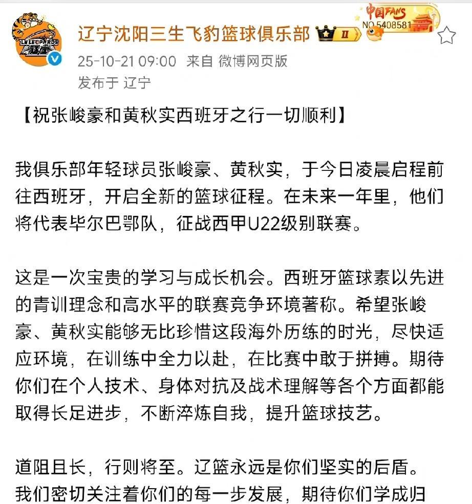 辽宁男篮大手笔!亲自把张峻豪和黄秋实送往西班牙联赛锻炼,声明:辽篮永远是球员们坚实后盾!不得不佩服俱乐部人脉资源,遍布全球,能加盟海外联赛,得益于西班牙籍外教洛佩斯的鼎力相助,试想三年后,两位小将学成归来,无论是比赛能力,经验,对抗强度都高出同龄人一大截,辽篮俱乐部召必回,拿必用,又增加两个即战力,海外联赛的张峻豪和黄秋实,国内联赛张陈治锋和李虎翼再合体