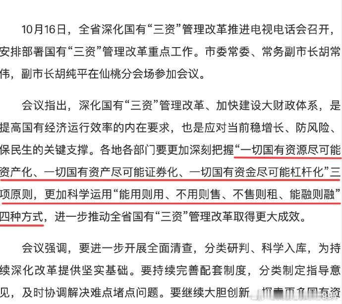 “一切国有资源尽可能资产化、一切国有资产尽可能证券化、一切国有资金尽可能杠杆化”项原则,更加科学运用“能用则用、不用则售、不售则租、能融则融四种方式,进一步推动全省国有“三资”管理改革取得更大成效。