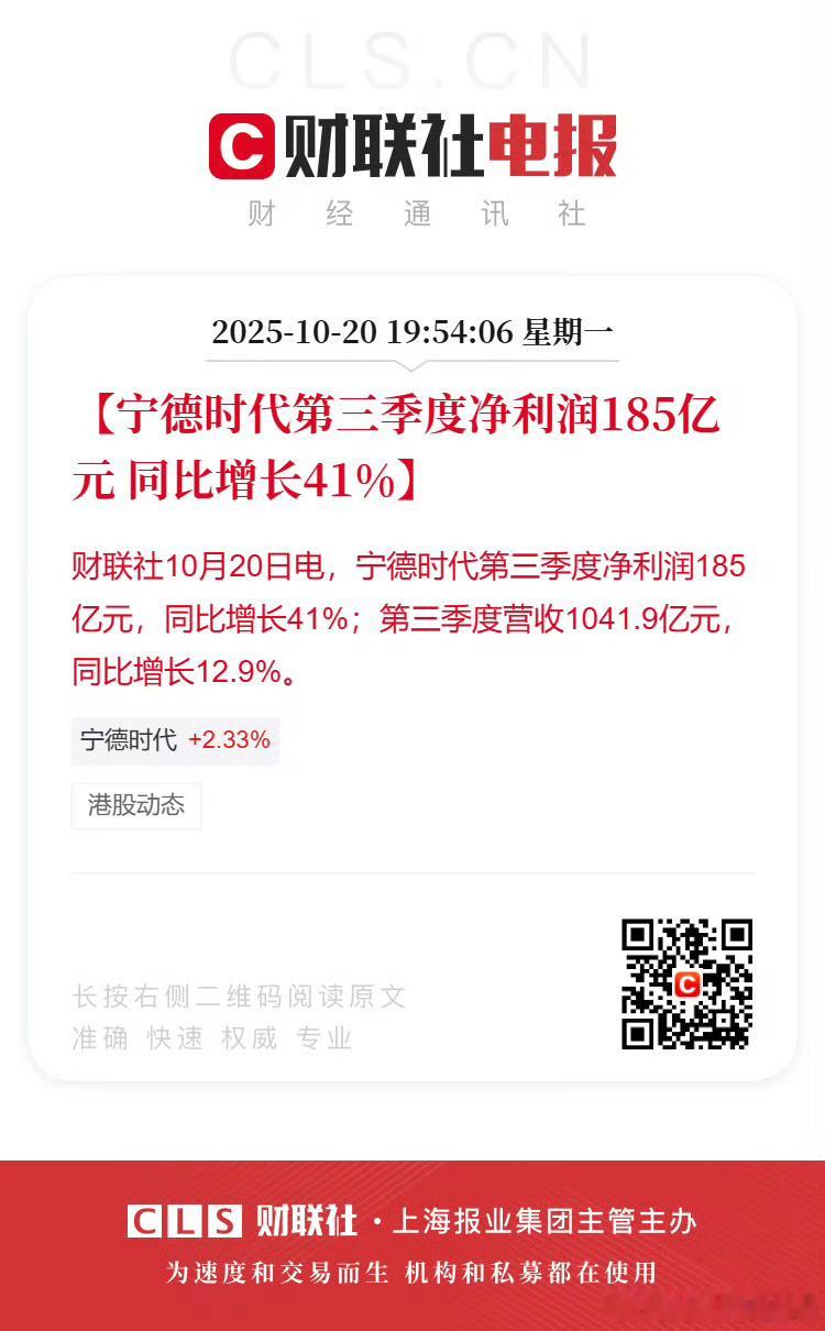 宁德时代第三季度净利润185亿净利润增长大于营收增长企业运营非常正向,会继续加大