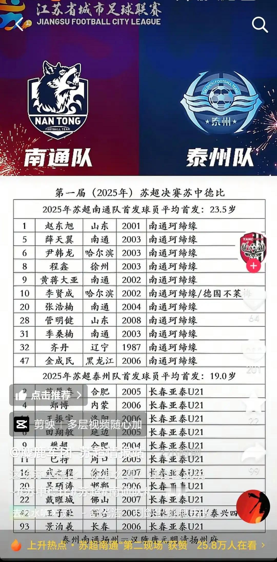 苏超决赛是南通珂缔缘VS长春亚泰? 昨天进决赛,珂缔缘老板说他们是江苏的孩子,意思就是对面并不是,希望得到省内球迷支持? 全国观众都在看戏,苏超不是说城市联赛,本地人的自豪归属感吗。 如果长春亚泰u21夺冠,那是外省人拿冠军。 决赛支持南通才是正确的吧! 这对于其他省的联赛也很重要,不要比拼外省资源,不纯粹了。 南通虽然是职业队,好歹在南通当地培养多年,是南通的球员![大金牙]