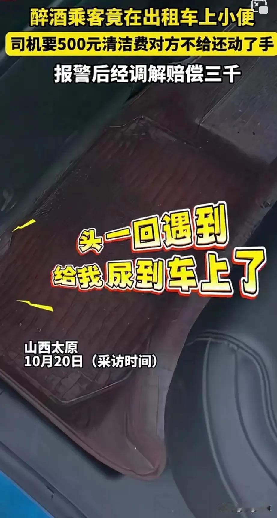 男子在出租车上小便司机要求赔500元了事,最终却赔了3000元。事发10月20日,山西省太原市,一名醉酒男乘客打了卢师傅的出租车,谁知在驾车中,卢师傅听到哗哗哗的声音还闻到一股尿骚味。 随后卢师傅停车查看,只见后座上男子脚下一滩水,裤子拉链还没拉上,其居然在出租车上小便,卢师傅十分气愤,要求其支付500元清洁费,这名男子不但不赔偿还动手打司机。 卢师傅立马报警,并不允许男子离开。警方赶到后,了解了事情经过,随后告诉这名男乘客,已涉嫌寻衅滋事行为,如果和卢师傅无法调解将拘留。最终,卢师傅要求赔偿3000元就谅解该男子,该男子随后向朋友借了3000元给卢师傅,双方各自离开。