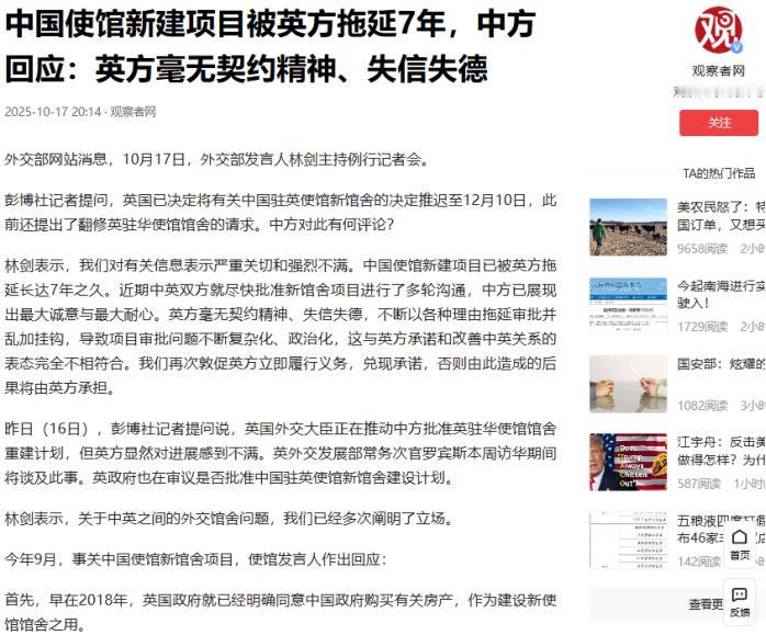 英国记者访问中国高志凯:如果英国政府不批准中国在英国新建大使国,中国将如何解决?高志凯明确表达:英国也不要想在中国北京建新使馆!同时让英国不要忘记了中国拥有强大的军事力量,英国侵略中国的历史中国人民没有忘记! 高志凯的回应算是把话说透了,英国要是在新使馆这事上继续耍花样,就别惦记着翻修北京的馆舍,更得掂量掂量中国的实力,那些侵略历史可不是过眼云烟。这话里的硬气,全是被英方一次次的操作逼出来的。 中国在英新使馆的事儿,说出来都让人觉得荒唐。早在2018年,英国政府就明明白白同意中方买下地块建馆,中方提交的规划设计方案还拿了当地专业机构的认可,连英国《城乡规划法1990》的要求都一一满足,按说审批早该落地。 结果呢?这一拖就是7年,近期更是直接把决定推迟到12月10日之后。 期间中方找英方沟通了一轮又一轮,诚意和耐心给得足足的,可英方全程揣着明白装糊涂,一会儿找个技术借口,一会儿又把其他议题乱搭过来,硬生生把一个纯粹的基建审批拖成了政治拉锯战。 外交部发言人林剑直接点破,这就是毫无契约精神,失信失德,嘴上喊着要改善中英关系,行动上全是背道而驰的操作。 更讽刺的是,英方一边拖着中方的项目,一边还盘算着让中国批准他们翻修驻华使馆,这种只许自己方便的双标做派,实在让人看不透底气在哪。 要是真讲外交对等,他们早该明白,自己怎么对别人,别人就会怎么对他们,高志凯说的那句“不要想在中国北京建新使馆”,不过是把对等原则摆到了台面上。 英方的恶意可不只停留在使馆项目上,10月15日的举动更显刻意。就在中国出台稀土相关出口管制新规6天后,英国突然跳出来,以“支持俄罗斯能源实体、向俄军事工业提供关键物项”为由,把11家中国企业列入制裁清单。 这11家企业涵盖了高端电子、工业材料和航天设备等领域,英方一挥手就冻结资产、限制贸易合作,摆出一副强硬姿态。 可稍微琢磨一下就知道,这根本不是什么原则问题,就是场精心设计的政治秀。 欧盟还在纠结怎么应对稀土新规,英国抢先对华出手,无非是想靠这种“抢跑”行为刷存在感,巩固和美国的战略纽带,顺便在欧盟面前充当“欧洲安全关键节点”。 他们大概忘了,中英经贸规模摆在那,近千亿英镑的合作里,藏着数千家英国企业的饭碗,这么折腾下去,最先受伤的可能是自己。 面对这种单边主义行径,中国驻英使馆当晚就硬气回应,明确说了中俄企业正常交往不该被干扰,英方的做法连国际法依据都没有,还放话“任何损害中方利益的行径都将坚决回击”。这份底气,不光来自外交立场,更来自实打实的实力。 9月底国防部的消息里说得清楚,福建舰已经成功完成歼-15T、歼-35等舰载机的弹射起飞和着舰训练,电磁弹射和回收能力稳稳落地,航母编队体系建设又迈了一大步。 更不用说北京香山论坛上亮相的“三位一体”战略核力量,东风系列导弹、“巨浪”潜射导弹齐齐展出,用事实证明中国的国防力量早已今非昔比。 今年还是中国人民抗日战争暨世界反法西斯战争胜利80周年,那段被侵略的历史早刻进了民族记忆里。 英国当年靠着坚船利炮打开中国国门的日子,和如今中国能挺直腰杆讲对等的现状,本身就是最鲜明的对比。英方要是以为还能像过去那样拿捏中国,或是觉得拖延个项目、制裁几家企业就能让中国妥协,未免太天真了。 他们一边享受着中英经贸带来的红利,一边又在外交和经济领域频频释放恶意,这种矛盾的操作,只会不断消耗自己的信誉。 有意思的是,英方似乎没意识到自己正陷入一个死循环:越想靠对华强硬换取所谓的“战略价值”,就越容易触碰中方底线;中方的回应越坚决,英方又得花更多精力去圆自己的双标说辞。 就像现在,既想拖延中国新使馆审批,又盼着中方批准自己的翻修计划,这种两头占便宜的算盘,怕是要落空了。 毕竟高志凯已经把话挑明,历史账、现实账,中国都记得清清楚楚,真要闹到撕破脸,吃亏的绝不会是有底气、讲原则的一方。