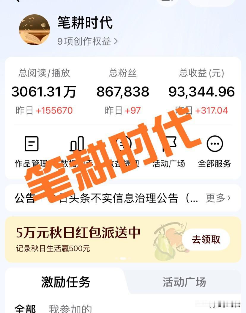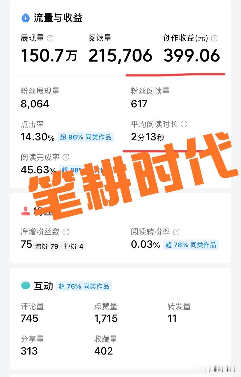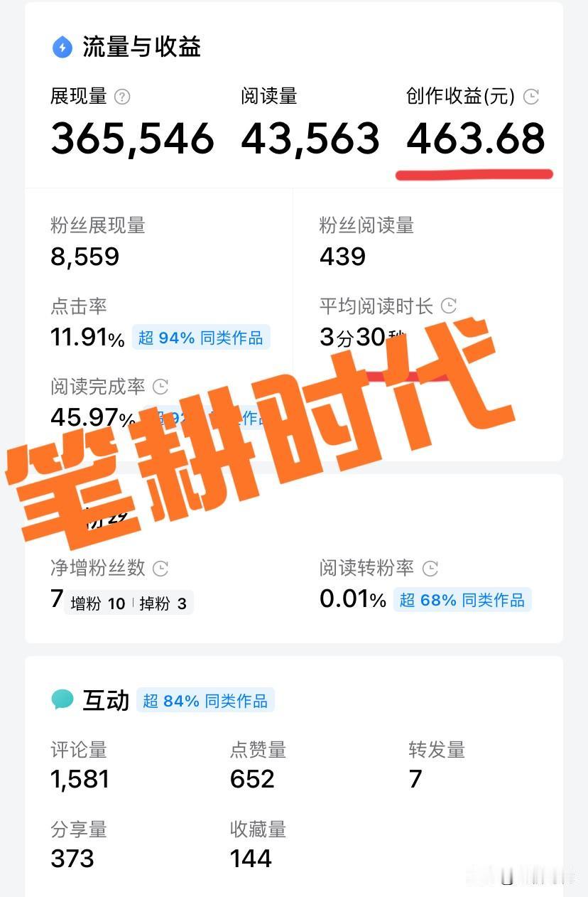 头条红利期似乎已过去了。上个月还有每万单价直逼100的,今日收益让我心里很受伤。近22万阅读量收益400还差一块。 上个月的一篇文章阅读量不到4万3千多,收益463元。今日的一篇22万左右的收益还不到400,原以为最低也有个七八百。让我白高兴一场。 比较这两篇文章的数据,只是4万多的这篇阅读时长有3分30秒,比22万的多一分多时长,但是转粉率后者还比前者多,至于阅读完成率和互动系数两篇差不多。 想不通这个单价收益整整相差近5倍啊! 今日收益一出,心凉半截,瞬间写作的欲望都没了。 来头条快两年了,真是一言难尽,上半年怎么发流量都超好,每天挣个上百不是难事。 现在是经常性地没什么流量,偶尔有个十几万的,单价却低得可怜,看收益都要怀疑人生。现在累得吐血也只挣个个位数。 终归说我自己心态不够好,看到收益低就郁闷。 有条友每天坚持50篇文章,只得几块,还说可以消磨时间交好友,同时情感输出的窗口。 也有条友说,看收益就不能写了,主要把写作当着习惯和爱好,偶尔也会有小惊喜,就坦然了。 我真佩服他们的心态,可是我做不到啊!