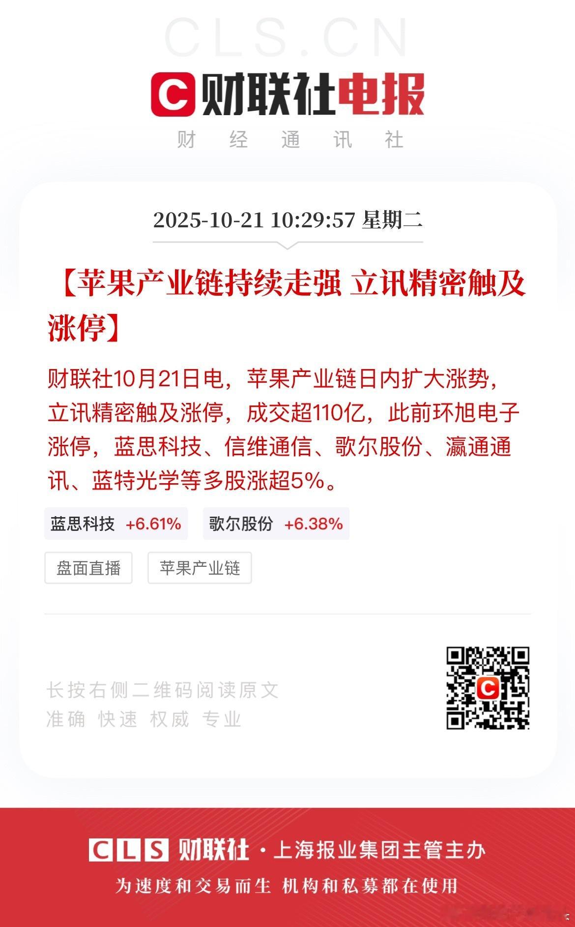 苹果产业链持续走强立讯精密触及涨停。