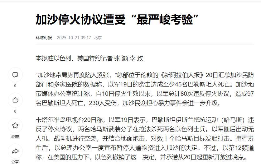 万万没想到啊,哈马斯果然上当了。不得不说,这出“停火-释放人质-翻脸”的戏码,以色列总理内塔尼亚胡算是玩得炉火纯青,连一点掩饰都懒得做。2025年10月那阵,在美国斡旋下,哈马斯跟以色列好不容易谈妥停火协议,说好哈马斯分阶段释放全部240名人质,以色列这边就分批放,2000名巴勒斯坦囚犯,还得扩大加沙的人道主义援助,可结果呢? 哈马斯这边刚把最后一批人质交出去,以为能给加沙百姓换几天喘息,以军的战机48小时内就炸到了加沙上空,对着数十个目标狂轰滥炸,还嘴硬说“所有目标都跟哈马斯有关”,又是武器库又是火力点,搞得好像自己多占理似的。明眼人都看得出来,这哪是什么“回应哈马斯违约”,分明是早就设计好的圈套。 其实,这停火协议从一开始就透着不对劲,满是算计的味道。协议刚生效没几天,以色列就开始找碴,先是抱怨哈马斯移交人质遗体的速度太慢,鸡蛋里挑骨头;接着又拿“安全威胁”当借口,把拉法口岸给关了,原本该运进加沙的人道主义物资全堵在外面。 要知道那会儿加沙早就缺粮缺水,多少老百姓等着这些东西救命,以色列倒好,协议里的承诺转头就忘,明摆着没打算好好履约。更讽刺的是,等哈马斯实打实把所有人人质都交完,没了谈判筹码,以色列立马变脸,抛出个“哈马斯计划发动新袭击”的理由,连点像样的证据都没有,就堂而皇之地重启军事行动。 这套路熟得让人恶心,2014年加沙冲突那回,以色列就是这么干的:先签停火协议骗哈马斯放松警惕,等对方按规矩来,自己转头就用“火箭弹袭击”当借口开打,这么多年过去,哈马斯居然还没吃够教训,实在让人着急。 内塔尼亚胡敢这么明目张胆地撕毁协议,根本不是一时冲动,全是为了自己的政治小命。他现在的执政联盟本来就不稳,极右翼政党“犹太力量”一直咬着要“彻底消灭哈马斯”不放,之前因为签停火协议,内阁都快闹崩了,执政联盟的席位缩到只剩微弱多数。2025年的政府预算还等着议会通过呢,要是不赶紧用军事行动讨好极右翼,预算通不过,他这总理位置就悬了。 而且他自己还背着官司,2023年哈马斯突袭事件里,他应对不力,正被司法调查盯着,现在重启对加沙的打击,就是想装成“战时领袖”,把国内注意力从他的丑闻上移开。这种“以战止谤”的把戏,以色列历史上又不是没演过,2006年黎巴嫩战争时,奥尔默特政府就靠这招转移过腐败丑闻的焦点,内塔尼亚胡不过是照猫画虎,可偏偏就有人吃这一套。 最可惜的是哈马斯,明明手握人质的时候还有谈判的底气,却偏偏误判了局势,把“善意”当成了能换和平的筹码。他们大概以为,只要按协议释放所有人质,国际社会就会站出来施压,逼着以色列履行承诺,可他们忘了两件最关键的事: 一是以色列从一开始就没打算停手,内塔尼亚胡多少次公开说,只有哈马斯彻底解除武装、加沙变成“非军事化地带”,战争才会结束,释放人质不过是以色列用来堵国际舆论嘴的手段,根本不是最终目的; 二是国际社会的双重标准早就烂透了,联合国虽然喊着停火,可美国自始至终都站在以色列那边,特朗普政府甚至私下放话,要是哈马斯不配合,就默许以色列恢复军事行动。等哈马斯把最后一个人质交出去,手里彻底没了牌,再想跟以色列谈,人家连搭理都懒得搭理,这不就是明摆着的“先缴枪再挨打”吗? 现在的加沙,早就成了人间地狱。截至2025年10月,近17万人在空袭中受伤,190万人没了家,只能挤在临时避难所里,92%的住房都被炸毁,连个遮风挡雨的地方都难找。联合国的报告里写得清清楚楚,加沙正在闹真真切切的饥荒,5.1万名儿童严重营养不良,瘦得只剩皮包骨,可以色列的空袭还在继续,而且根本不管什么民用设施,医院、学校照样炸,美其名曰“打击哈马斯据点”,实际上就是在搞“集体惩罚”。 说真的,哈马斯这次的遭遇,算是给所有想跟以色列谈“善意”的人提了个醒:在中东这片土地上,光靠退让和妥协换不来和平,以色列的扩张主义本质就摆在那儿,只要他们还想控制加沙,就绝不会轻易放弃军事手段。 哈马斯要是真想保护巴勒斯坦人,与其一次次掉进以色列的圈套,不如好好想想更务实的策略,别再让老百姓跟着受连累。而国际社会也该醒醒了,联合国安理会的决议一次次变成废纸,美国一边喊着“人权”一边给以色列递武器,这种装聋作哑的态度,只会让加沙的悲剧越演越烈。要是真有心调停,就该拿出实际行动,比如对以色列实施制裁,逼着他们回到谈判桌前,而不是任由内塔尼亚胡胡作非为。 说到底,战争里没有真正的赢家。真希望有一天,加沙的硝烟能彻底散掉,孩子们不用再在防空洞里睡觉,能在阳光下好好跑一跑,不用再害怕下一秒会不会有炸弹掉下来。可现在看,这个愿望还远得很。