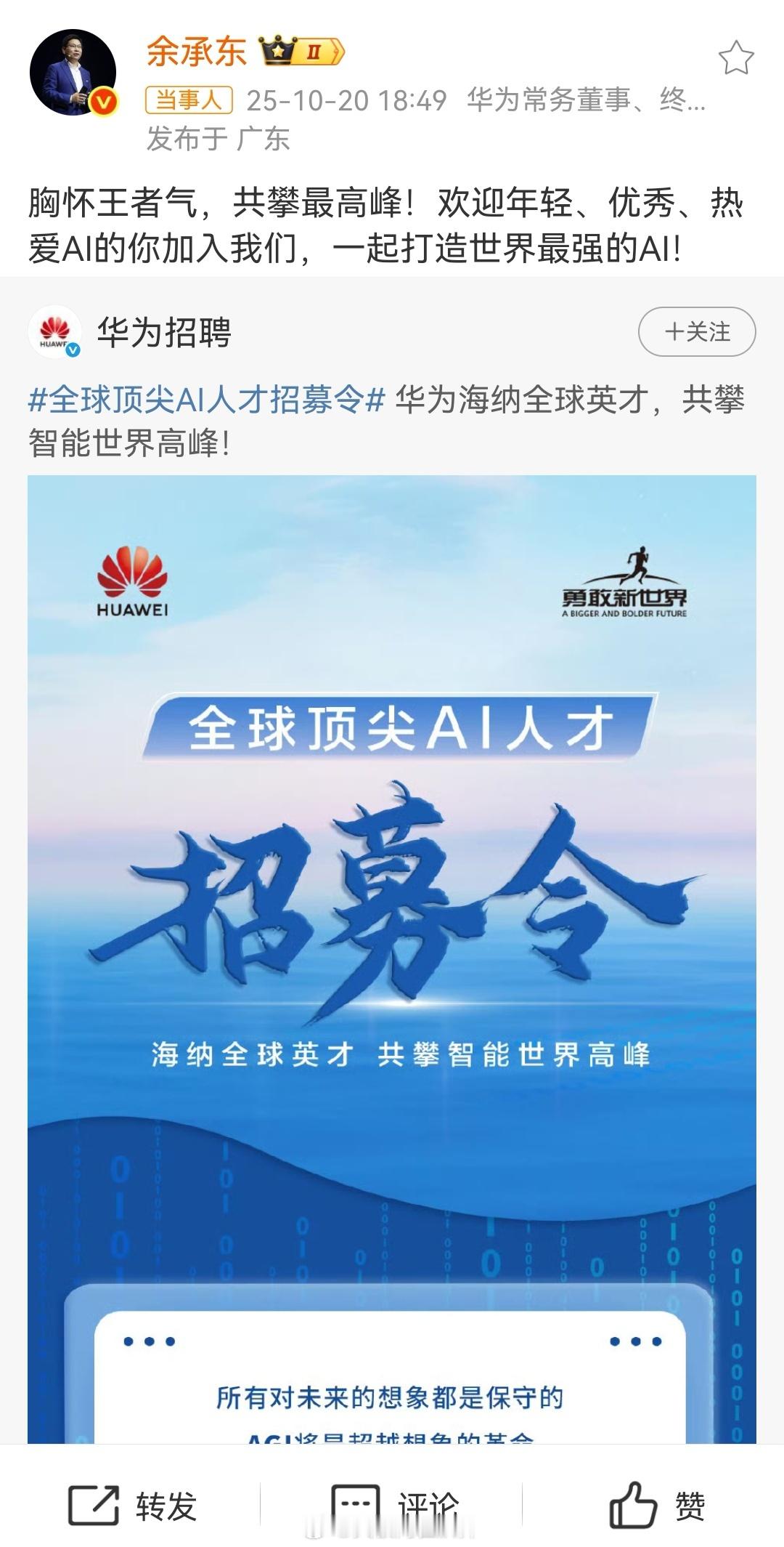 10月20日,华为常务董事、终端BG董事长兼新任IRB(产品投资评审委员会)主任余承东,通过微博亲自发布“全球顶尖AI人才招募令”。这是他9月29日接掌IRB后的首条战略级动作,以双重身份吹响华为AI人才攻坚的号角,彰显公司争夺全球AI制高点的坚定决心。
