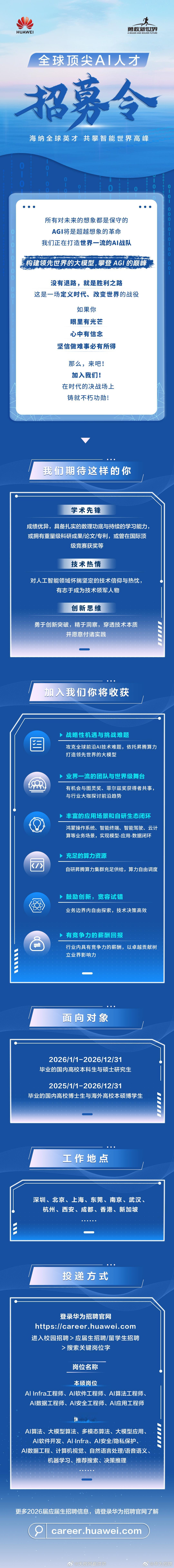 华为对人才的筛选设立了三大核心标准:学术上需为先锋力量,拥有顶级科研成果或竞赛获奖经历;需具备坚定的AI信仰与技术热情;更要拥有勇于突破的创新思维。岗位设置全面覆盖AI核心领域,包括AI算法、大模型开发、多模态技术、数据工程、安全隐私等关键方向,构建起完整的AI技术人才矩阵。