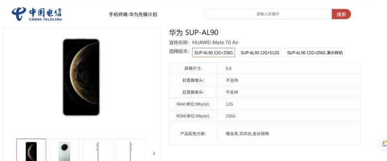 华为的第一款eSIM机型正式曝光?目前华为一款名为Mate70 Air的机型出现在电信官网,6.9寸的屏幕,全系12G运存,配色方面还是熟悉的曜金黑,羽衣白和金丝银锦;至于有朋友问:为什么不用Mate80系列做eSIM的首款机器?其实原因也很简单,一个是抢时间,另一个成本问题,目前eSIM在手机终端算刚开始,还有很多的明细要进行完善修正,且eSIM的市场预期还有待进一步评估,用mate70已成熟的平台来试水和卡位,确实算很好的方案。