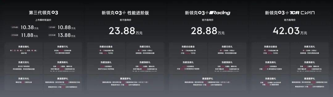 国内车企现在发布的车是越来越贵了,离我们工薪阶层是越来越远。可别忘了当初你们可是依靠着我们普通工薪阶层的买买买才能发展到如今地步。如今新车发布动不动小30万,30万可不是一笔小数目,有的小地方差不多都能买套房了。 新领克03+性能进阶版官方指导价23.88万元;新领克03+Racing官方指导价28.88万元;新领克03+TCR Cyan官方指导价42.03万元。