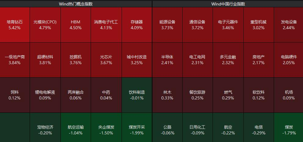 从板块上来看,重型机械板块走强,房地产板块多股涨停,苹果产业链、电子元器件、CPO等板块表现活跃;煤炭、航空、宠物经济板块震荡调整。