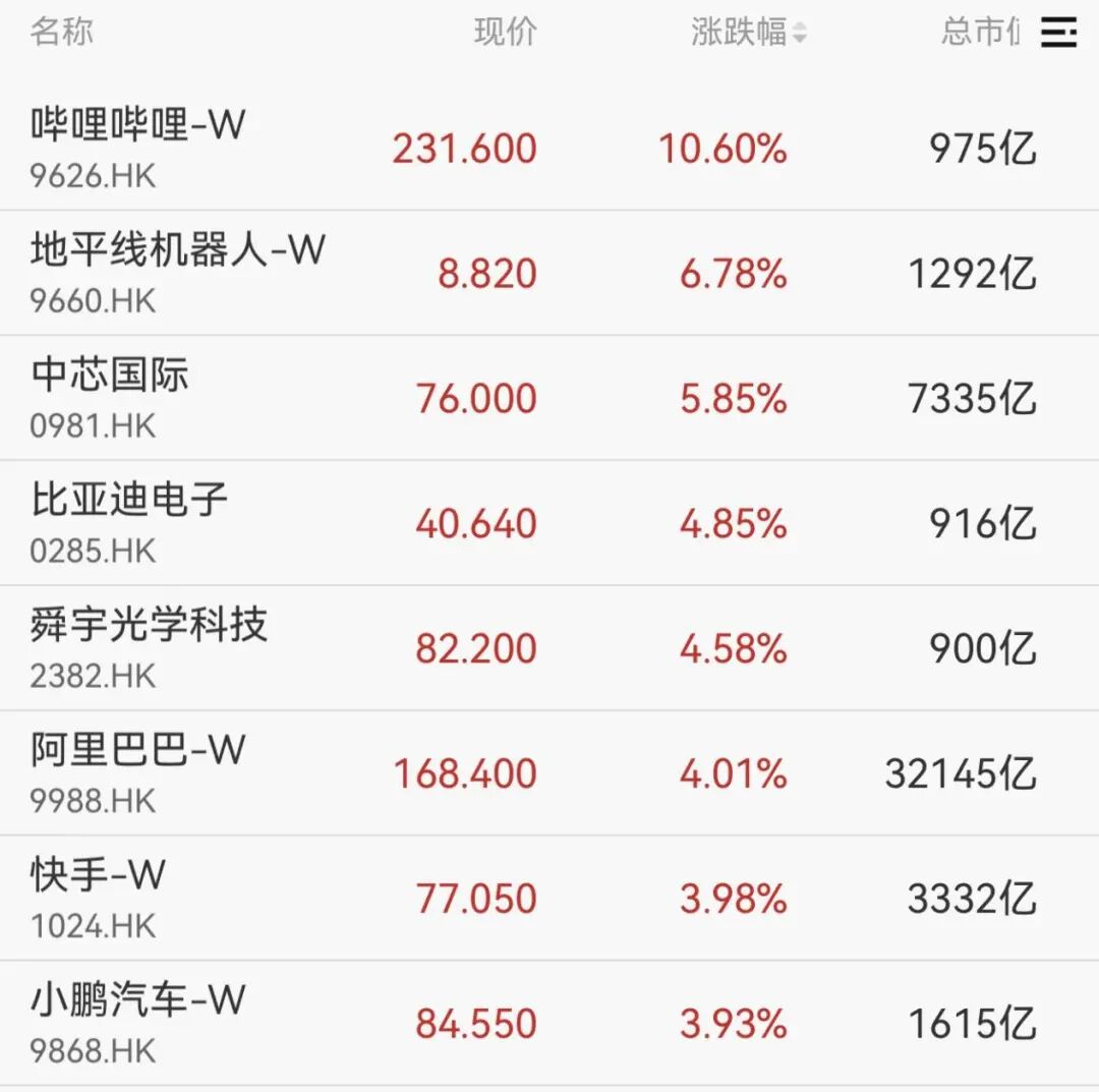 港股方面,恒生科技指数持续走强,哔哩哔哩涨超10%,中芯国际、比亚迪电子、阿里巴巴涨超4%。