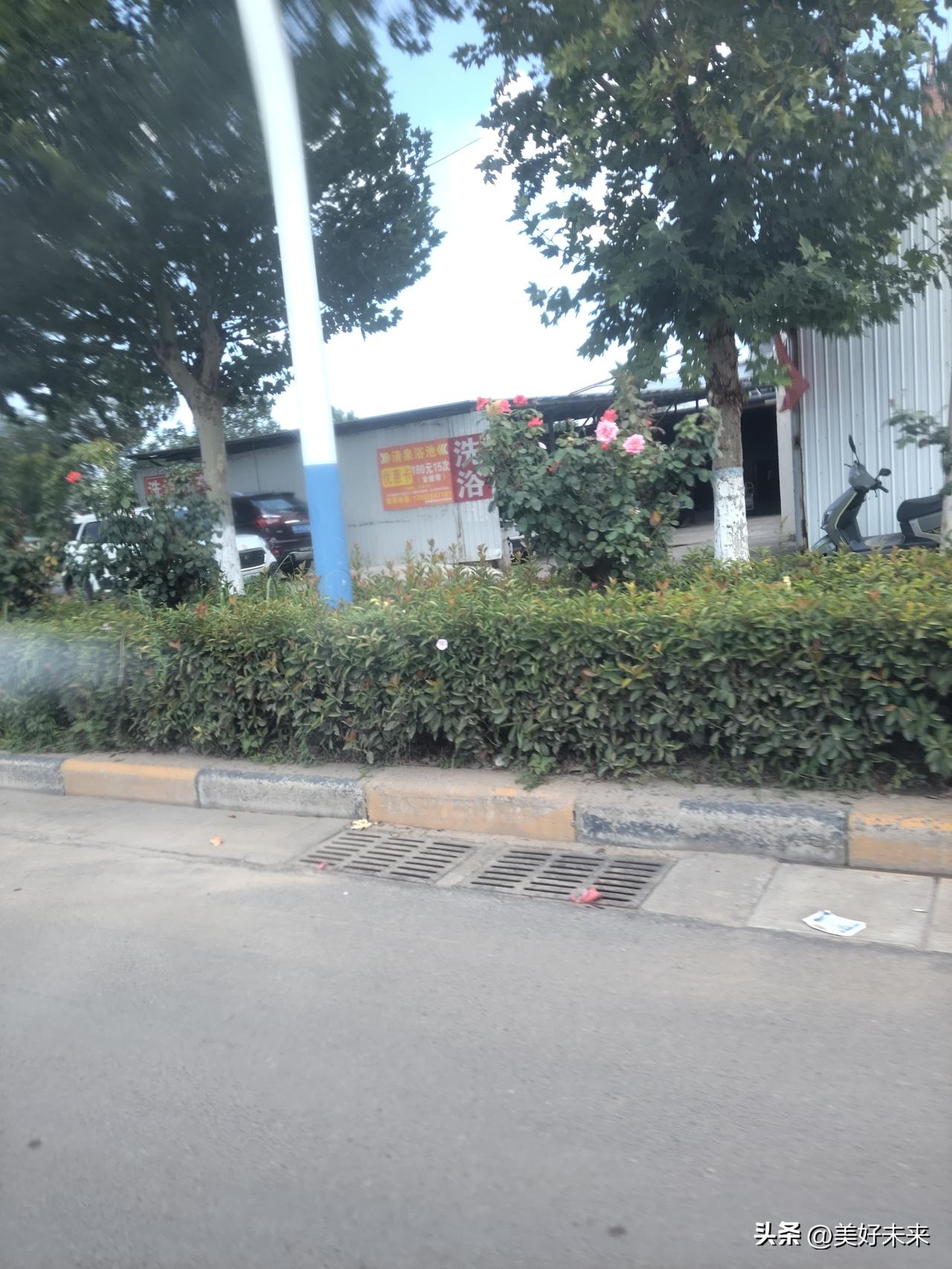 公路旁,景致颇为动人。翠绿的灌木丛整齐排列,其间点缀着几株开得正盛的花,粉的、红的花瓣娇艳欲滴,在阳光下闪烁着光泽。旁边的树木枝叶繁茂,投下片片阴凉。不远处,还有车辆停放,以及带有“洗浴”字样的招牌,增添了生活气息。蓝天澄澈,微风拂过,花草轻轻摇曳,整个画面充满了生机与惬意,让路过的人都能感受到这公路旁的美好。