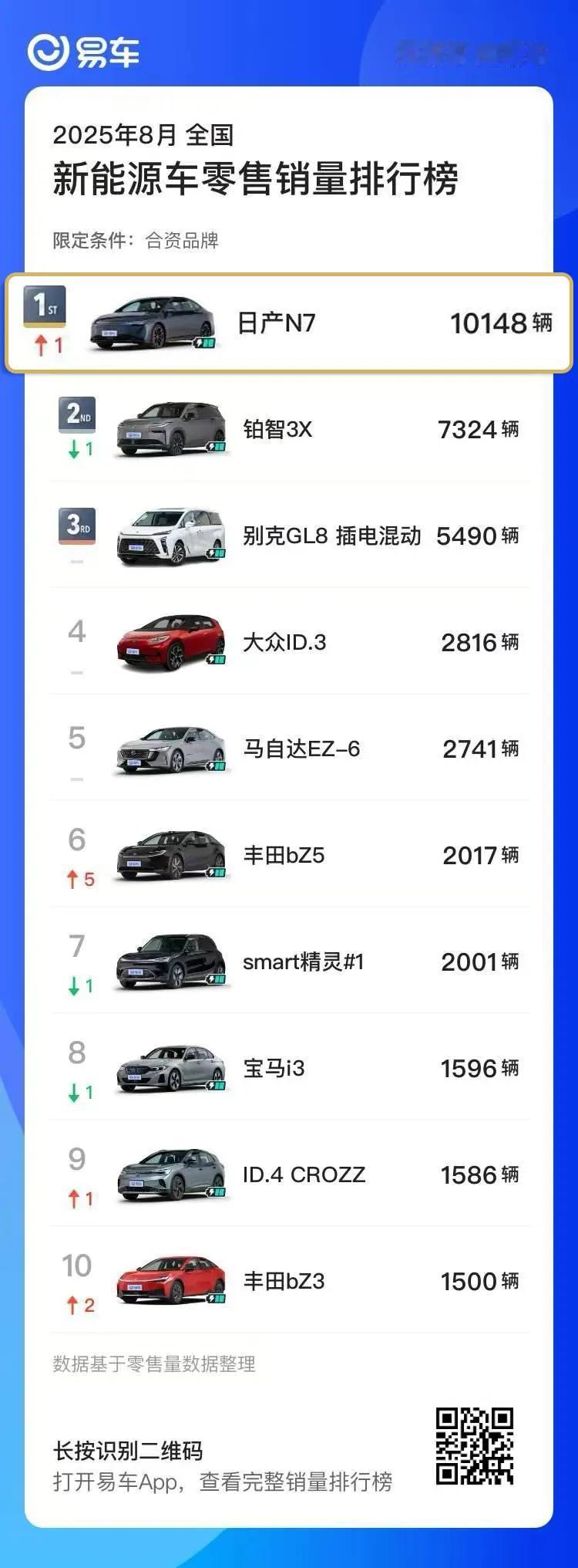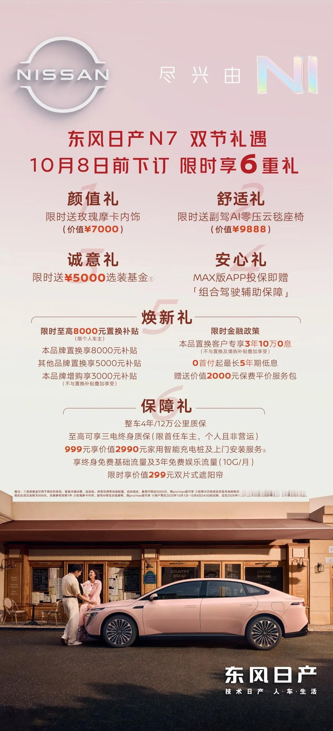 都看到了吧,8月的国内新能源市场竞争真的是够激烈的啊,特别是纯电车型已经成为了越来越多人的选择。而作为合资品牌,东风日产N7却是表现出了相当耀眼的成绩,交付量与销量双双突破万辆,不仅创下自身上市后的最佳战绩,更刷新了合资品牌纯电车型的单月销量纪录,这无疑标志着合资新能源迈入了全新的发展阶段。 作为天演架构下的首款车型,东风日产N7以“超舒适纯电家轿”的精准定位,成功切入主流家庭市场。其真五座空间、AI零压云毯座椅以及全域防晕车技术等核心亮点,构筑起差异化的产品优势。 东风日产N7连续月销破万,充分证明了消费者对合资品质与本土化创新融合的高度认同。当前正值“金九银十”购车热潮,东风日产N7适时推出双节限时6重礼遇,进一步坚定用户购车决心。这一系列举措,不仅巩固了其“14万级最‘家’纯电轿车”的市场地位,更为合资品牌在新能源领域的竞争力提升带来了极大的信心。 日产N7双节宠粉六重礼