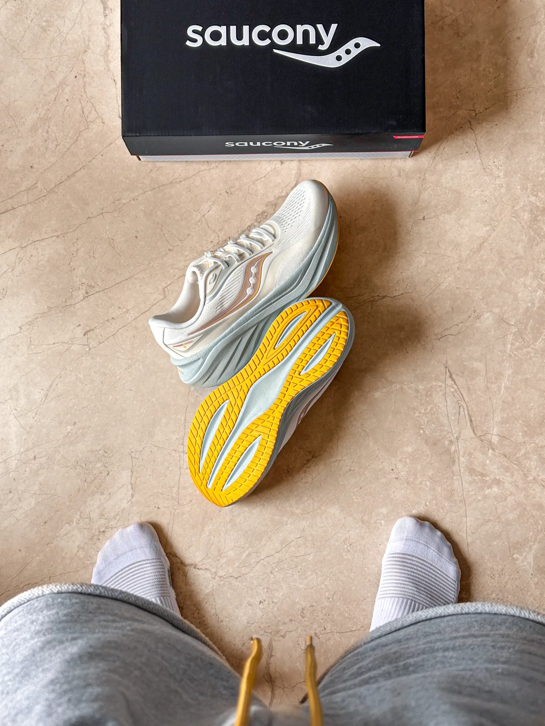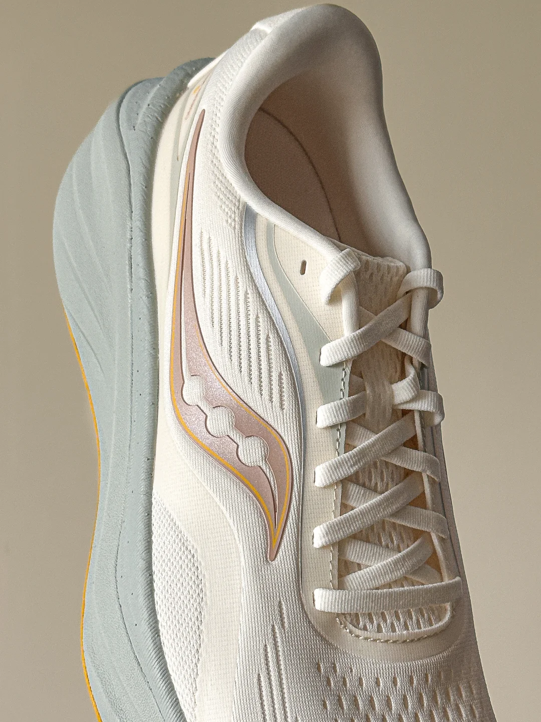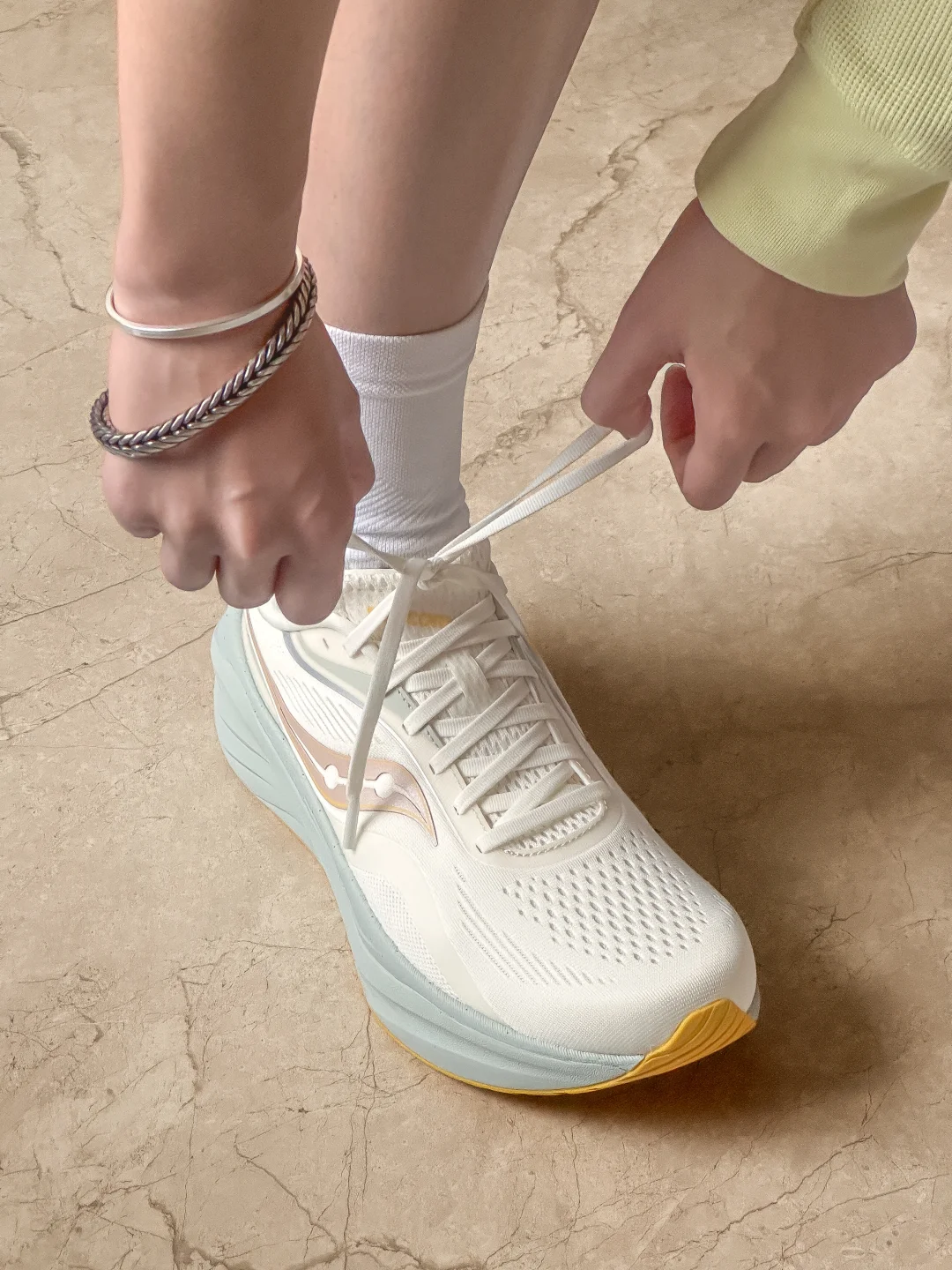 这双配色叫米咖啡,整体呈现了淡雅清新的风格;鞋面和内衬都是米白色、索康尼的标志是金咖色、鞋底和鞋身上的细节点缀都是明黄色,营造了一体化的温暖感;同时整个中底采用了很淡的蓝色,视觉上有种云彩☁️棉花糖的感觉。