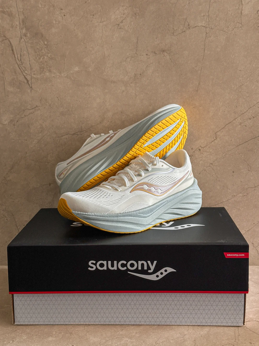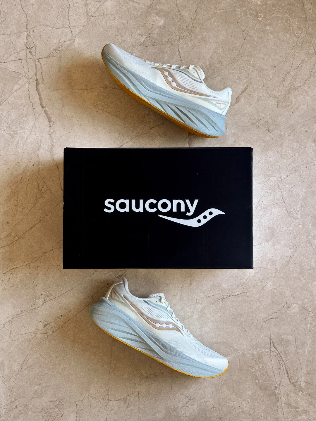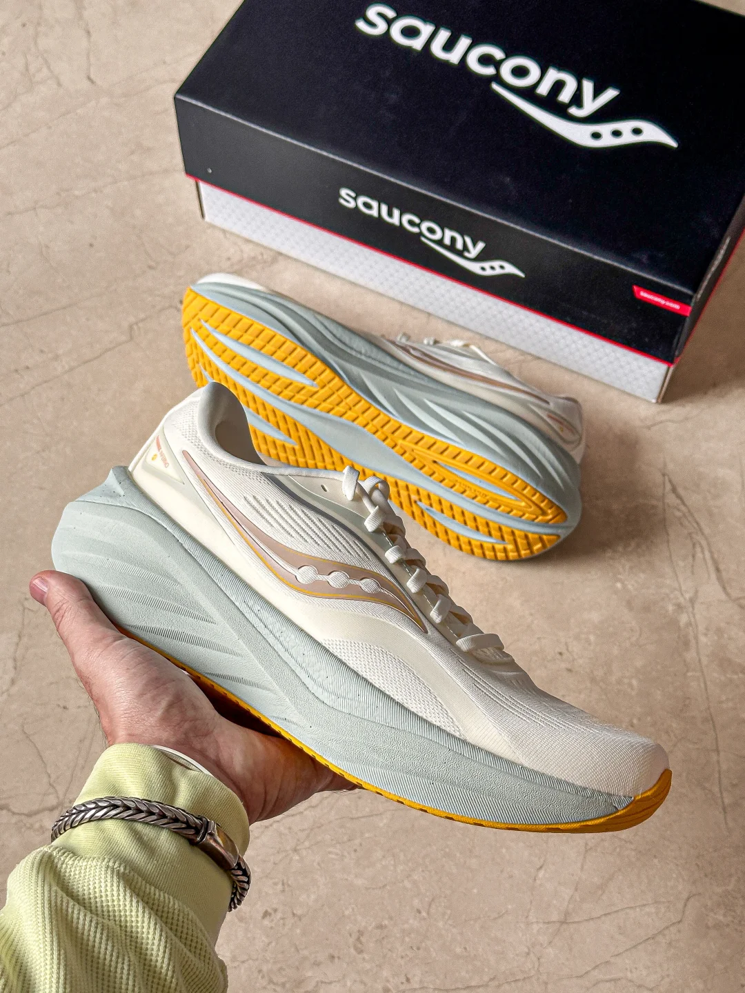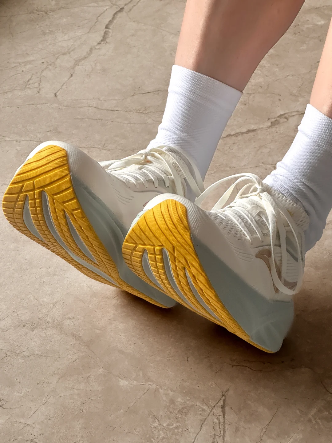 这双配色叫米咖啡,整体呈现了淡雅清新的风格;鞋面和内衬都是米白色、索康尼的标志是金咖色、鞋底和鞋身上的细节点缀都是明黄色,营造了一体化的温暖感;同时整个中底采用了很淡的蓝色,视觉上有种云彩☁️棉花糖的感觉。