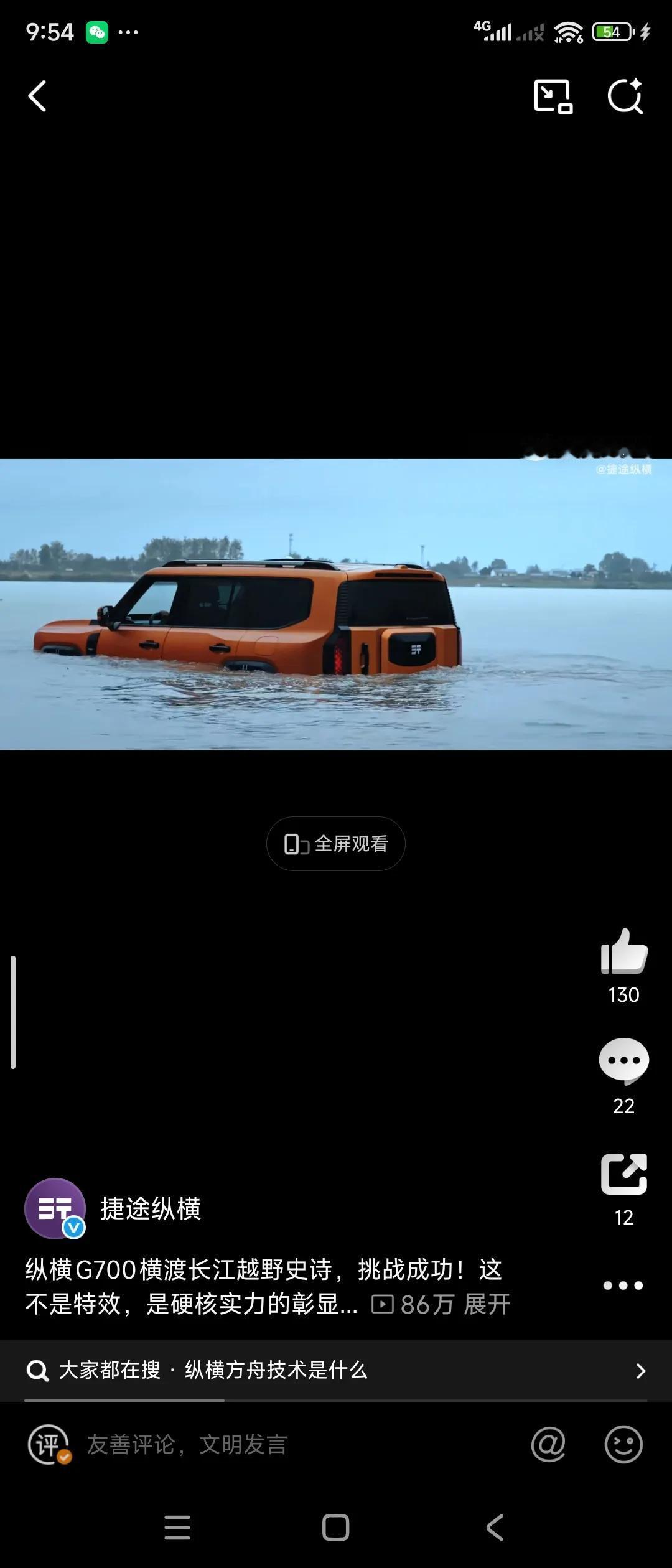 还得感谢比亚迪,当初要不是仰望u8在车展上大秀涉水功能一炮而红,奇瑞也不会这么认真的打造捷途纵横G700,一台“水陆两栖”新物种,都是涉水,但航行和刨水还是有本质区别的,捷途纵横G700用时22分钟横渡长江,凭借的是奇瑞硬核的“纵横方舟技术”,包括密封性能、浮水姿态、水上驱动及航行控制,车尾配置两个推进器,以7km每小时的速度乘风破浪,这样的游艇级航行能力让G700成为全球唯一横渡长江的越野车。这算不算突破硬派越野的天花板?魏建军感到压力了吗?答案是否定的,长城绝不会跟风造一台能横渡黄河的坦克,因为那不符合魏建军的调性,懂得都懂。