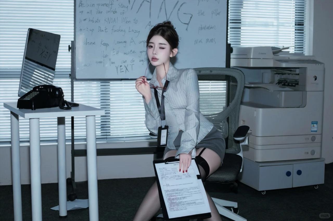 职场禁忌风写真|条纹衬衫+红高跟黑丝,复古电话旁的妹妹性感又带感~