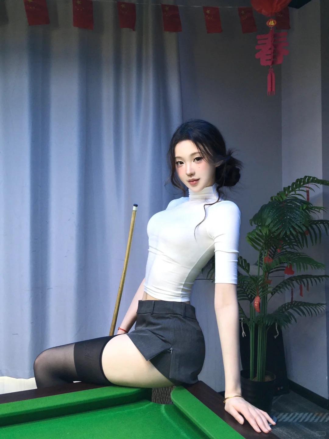 台球室辣妹风写真|白上衣黑短裙+镂空黑丝,妹妹握球杆的模样性感又带感~