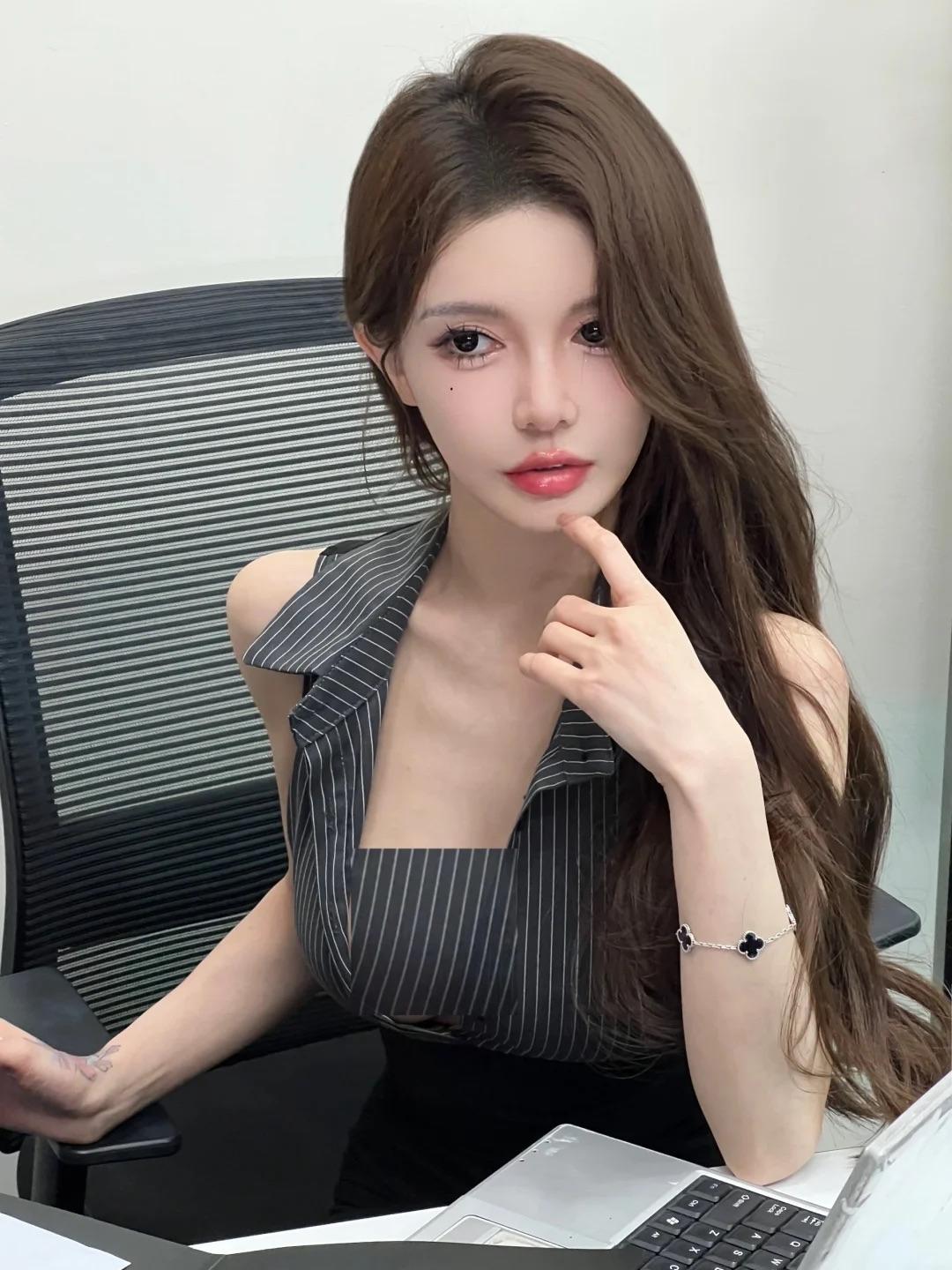职场辣妹风写真|条纹露肩装+四叶草手链,妹妹在工位的纯欲感直接封神~